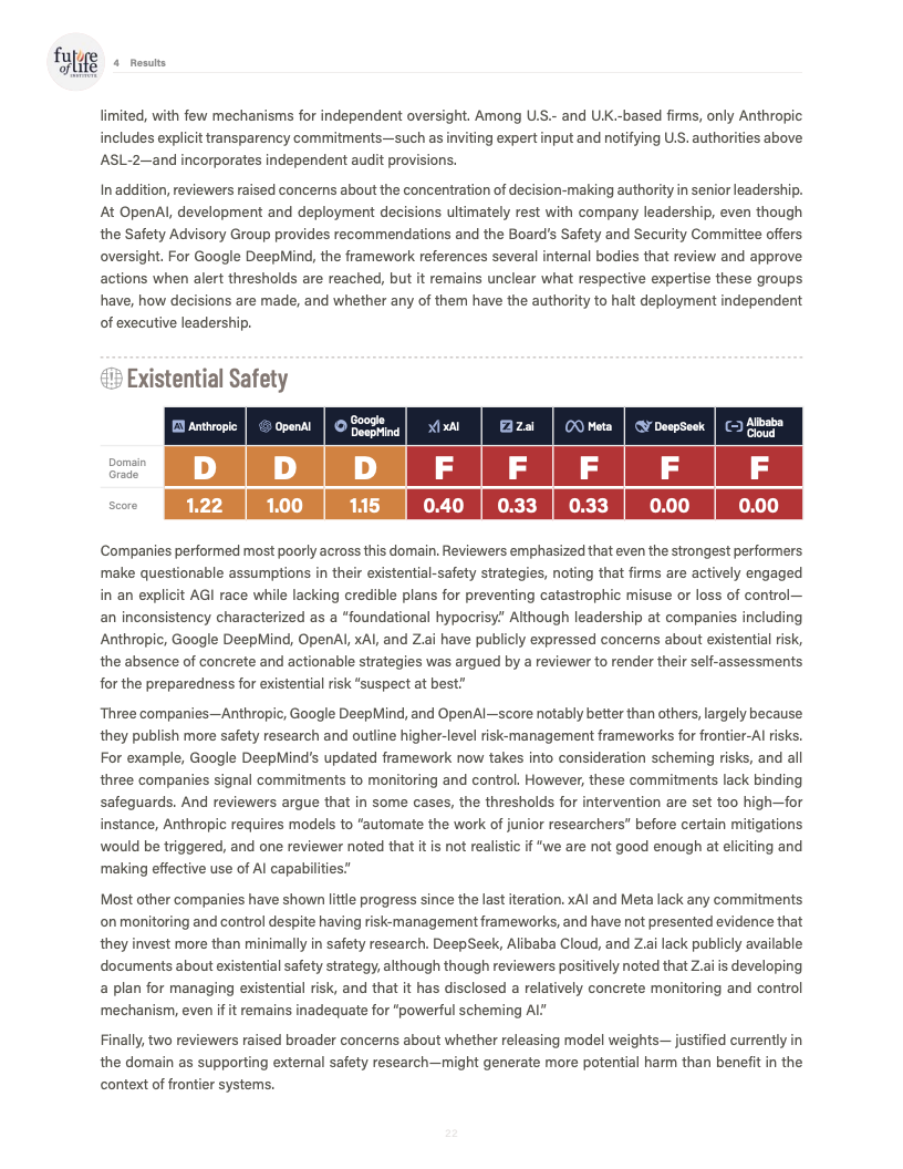 在生存性风险与长期安全方面,连续两期评估中,没有任何公司在该维度获得高于 D 的评分。尽管部分企业高层开始更频繁地公开讨论灾难性风险,但这些表态尚未转化为可量化的安全目标、清晰的触发阈值或有效的内部监控与控制机制。能力雄心与风险治理之间的落差依旧显著。