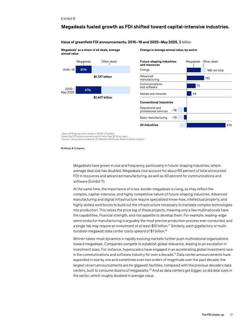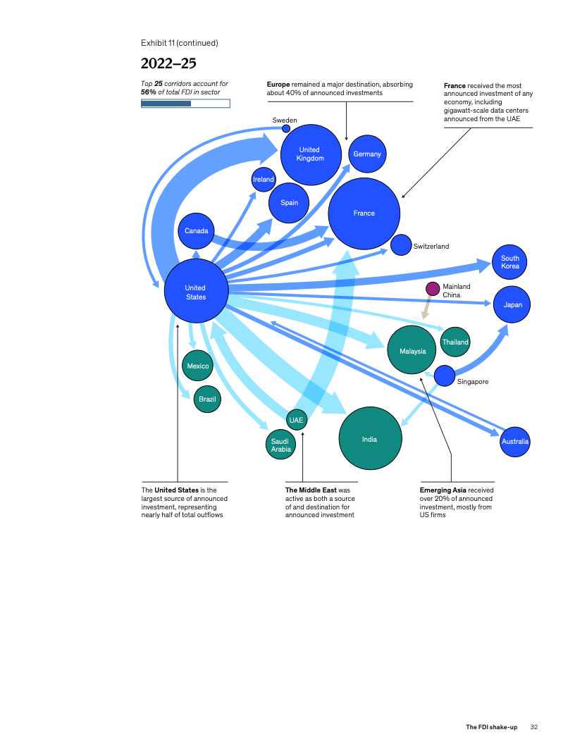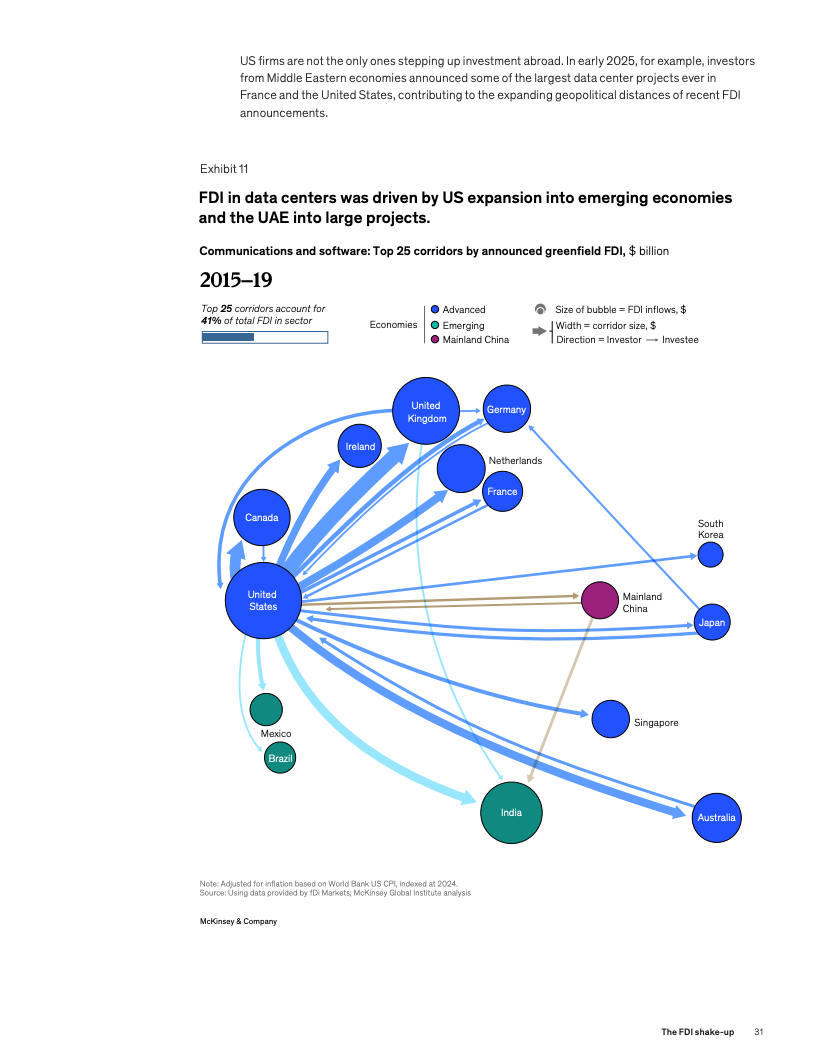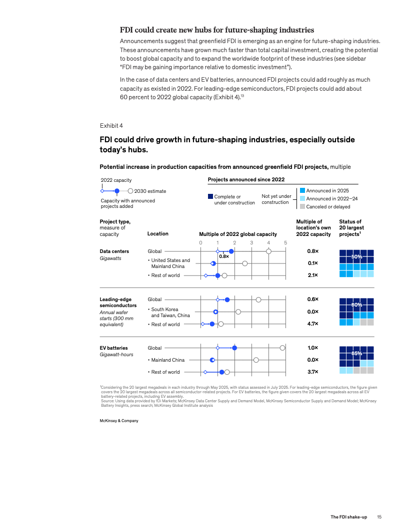从行业结构看,2022年以来,约四分之三的跨境FDI公告流向先进制造、数据中心、半导体、电动车与电池,以及能源和关键矿产等领域,而在2015至2019年这一比例仅约为一半。按2024年不变美元计,未来塑造型产业相关投资年均规模超过1400亿美元,其中仅数据中心一项就达到约1700亿美元,成为增长最快的细分方向。这表明资本正在集中押注高技术、高资本密度、赢家通吃的产业赛道。
