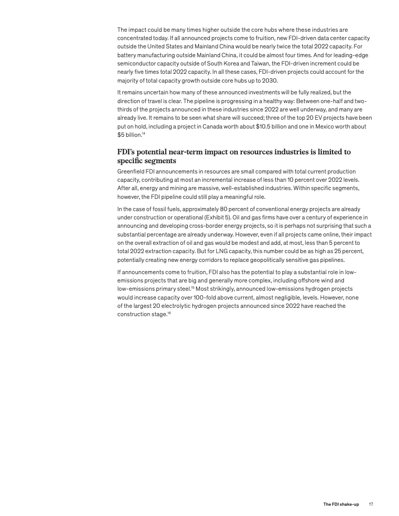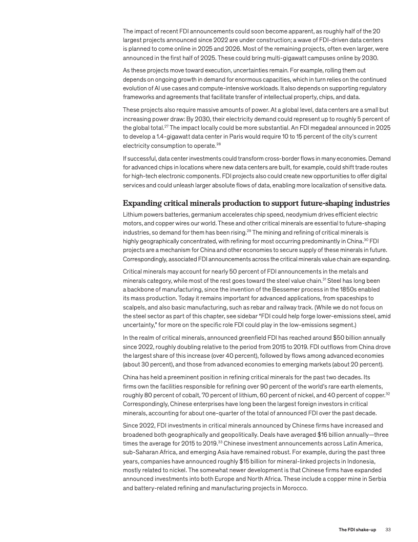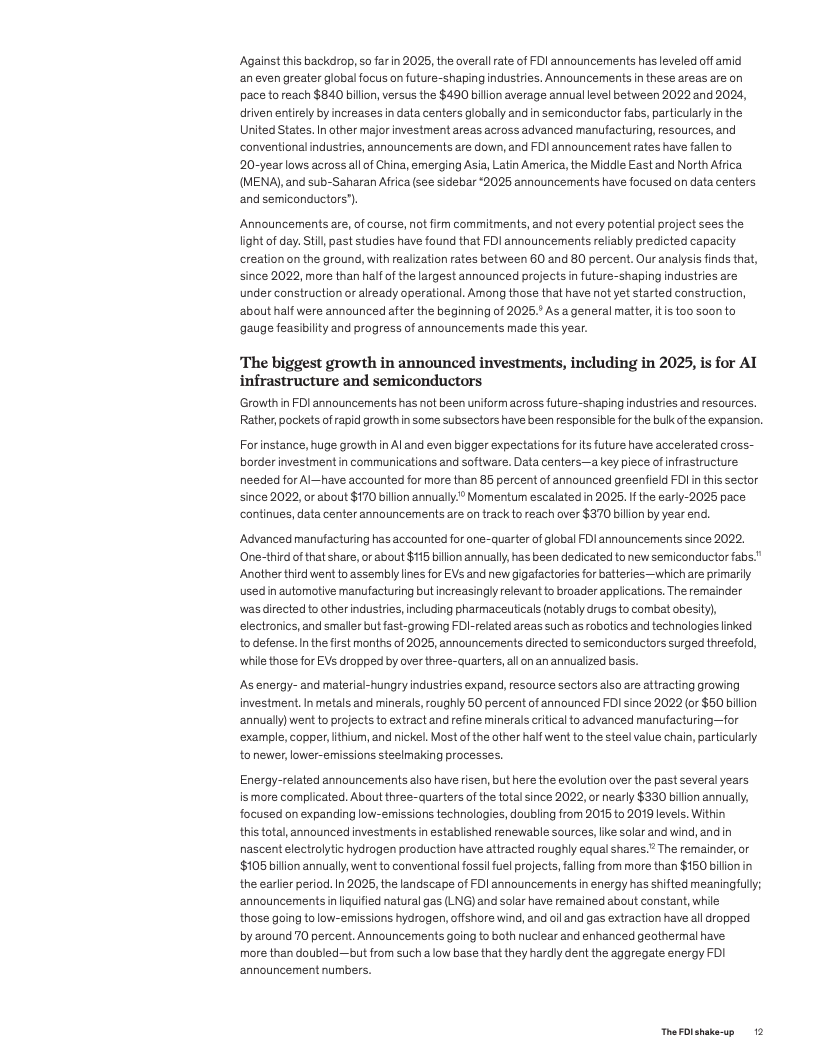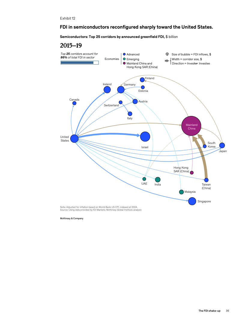 从行业结构看,2022年以来,约四分之三的跨境FDI公告流向先进制造、数据中心、半导体、电动车与电池,以及能源和关键矿产等领域,而在2015至2019年这一比例仅约为一半。按2024年不变美元计,未来塑造型产业相关投资年均规模超过1400亿美元,其中仅数据中心一项就达到约1700亿美元,成为增长最快的细分方向。这表明资本正在集中押注高技术、高资本密度、赢家通吃的产业赛道。
