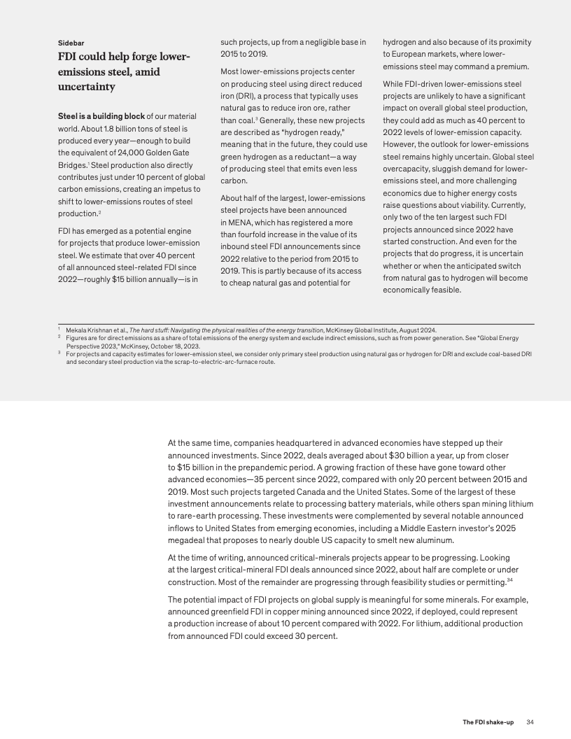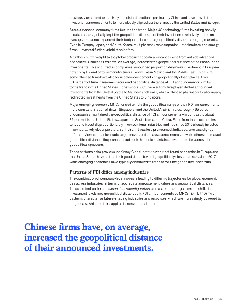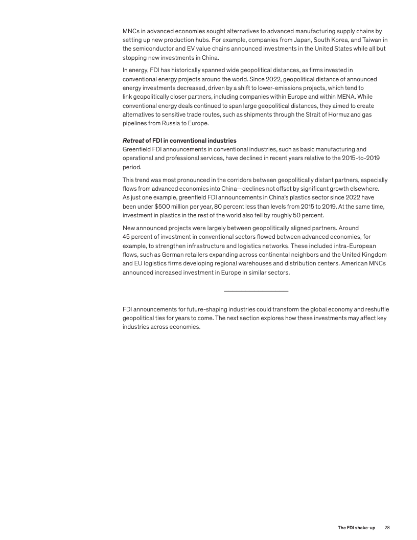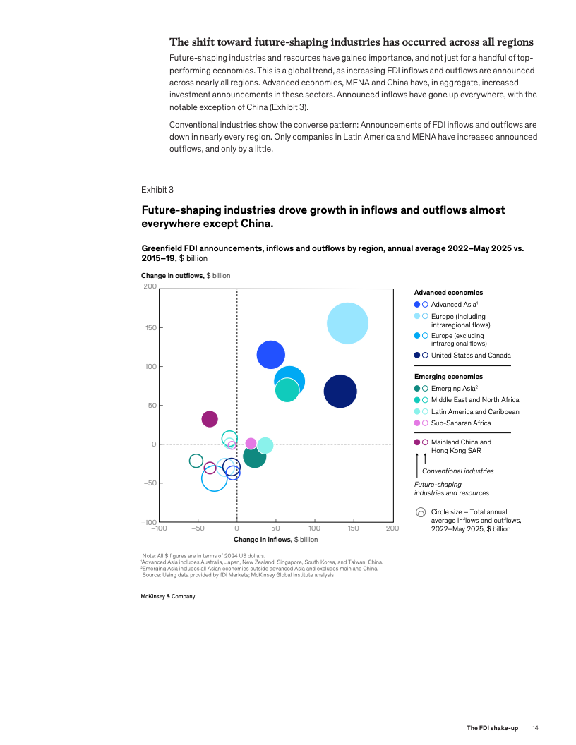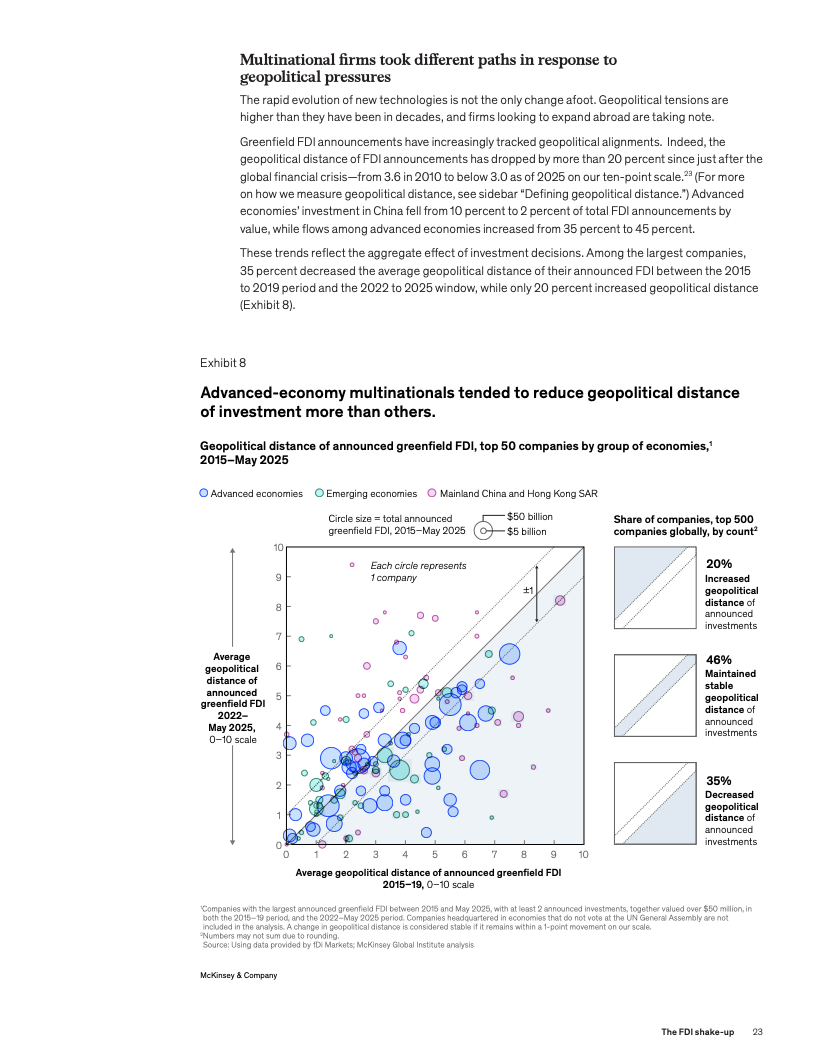 从地缘结构看,FDI公告的“地缘政治距离”自2017年以来下降速度约为贸易的一倍。发达经济体之间的相互投资明显增加,而对中国的投资公告规模较2015至2019年下降近三分之二。与此同时,中国从主要投资接受国转变为重要投资输出国,其在欧洲、中东和拉美的投资公告规模较此前增长超过三分之二,显示出资本流向的双向重组。