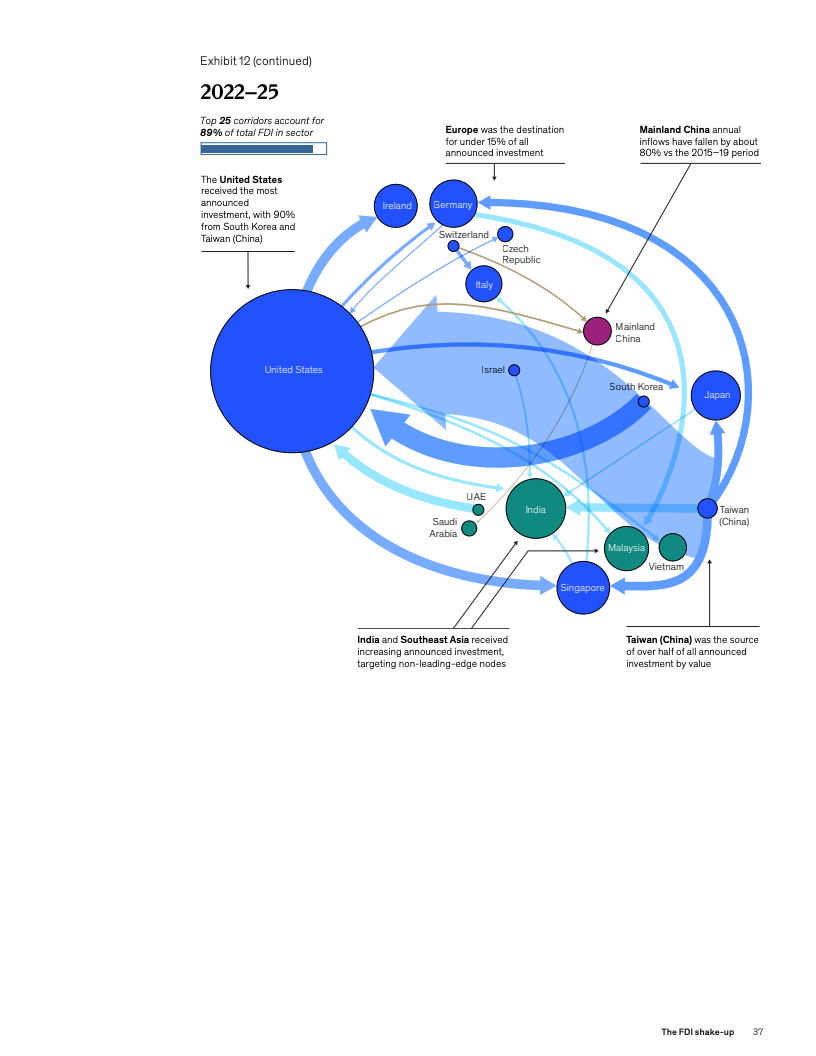 从区域分布看,美国成为本轮FDI重构中最突出的受益者。2022年以来,美国年均吸引的FDI公告规模较疫情前几乎翻倍,尤其在半导体和AI基础设施领域占据全球核心位置。相比之下,欧洲和先进亚洲的增幅更为温和,而新兴经济体在2025年前几个月的FDI公告已降至二十年来低点,区域分化明显加剧。