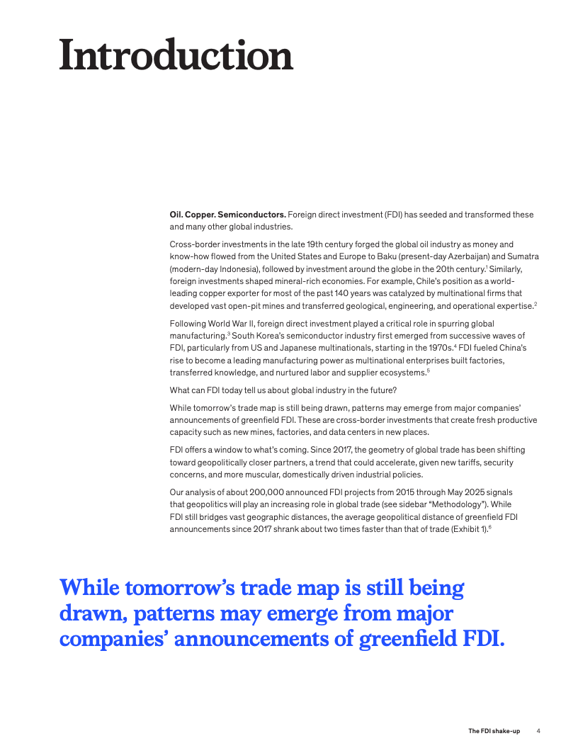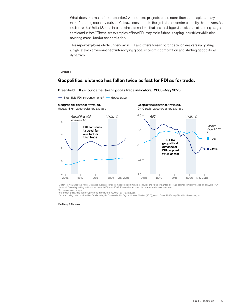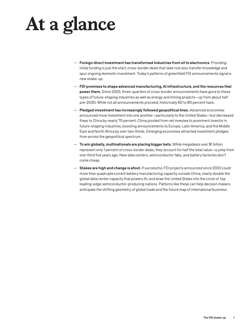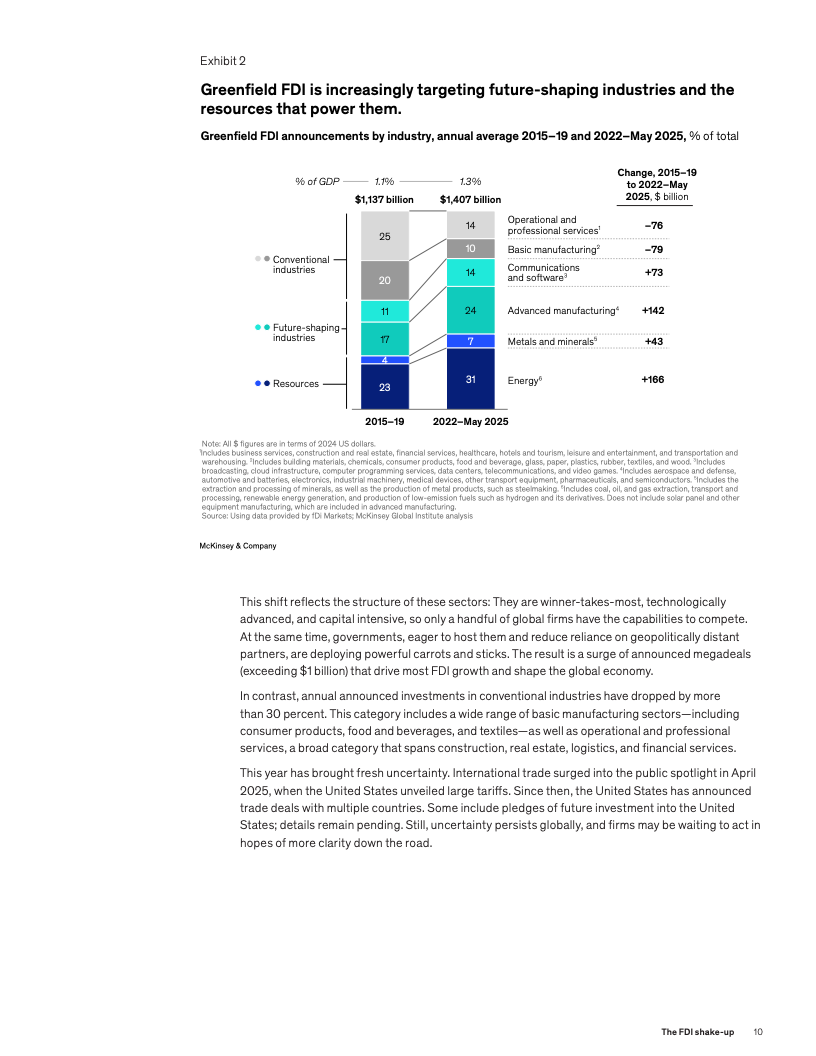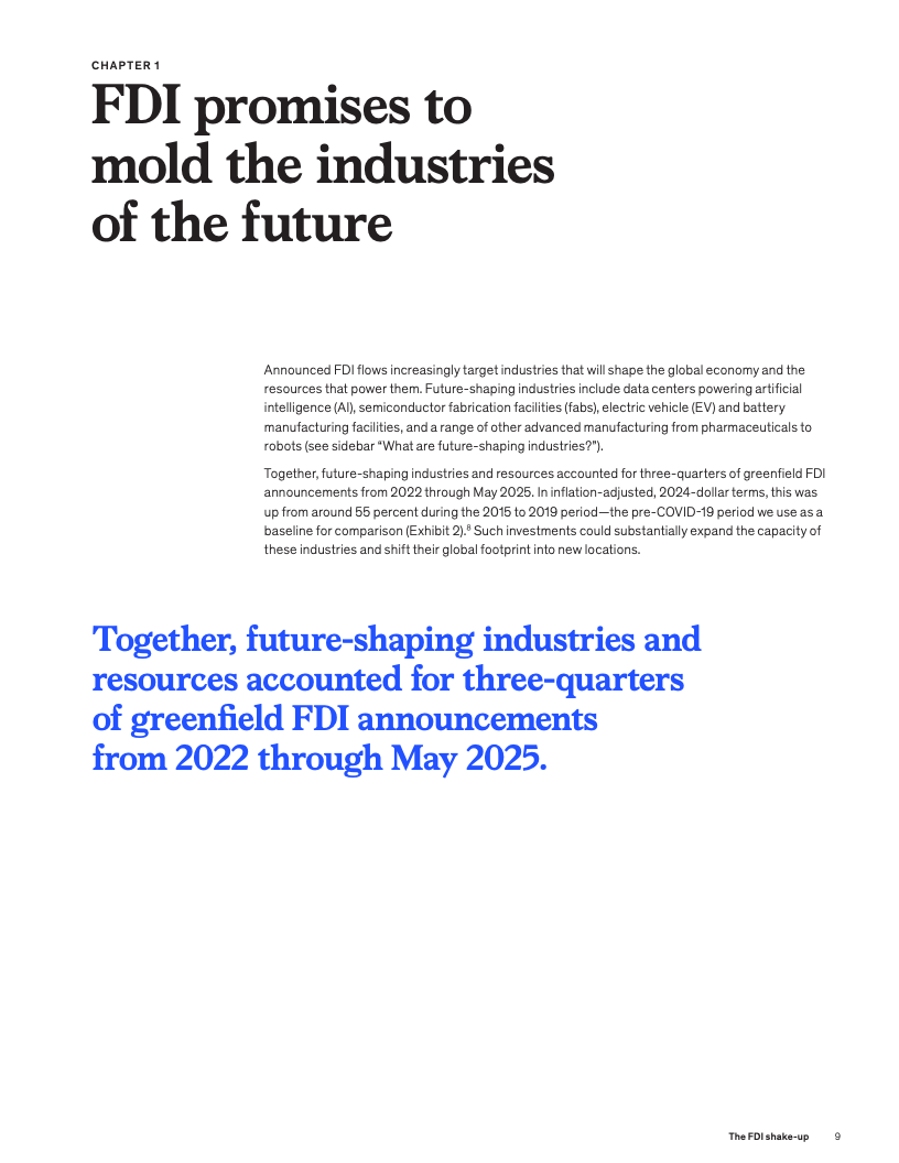 过去一个多世纪,外商直接投资一直是塑造全球产业格局的关键力量。报告基于2015年至2025年约20万条绿地FDI项目数据发现,新一轮FDI正在显著转向“未来塑造型产业”,并呈现出更强的地缘政治取向。这一变化意味着,FDI不再只是资本流动,而是正在成为重塑全球产业布局和贸易结构的前瞻性信号。
