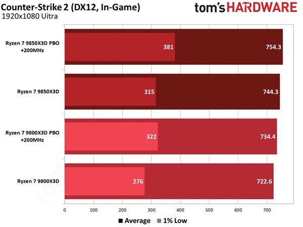 在《CS2》中,无论是9800X3D还是9850X3D,开启PBO并增加200MHz之后,平均帧率都大约提升了1.5%。