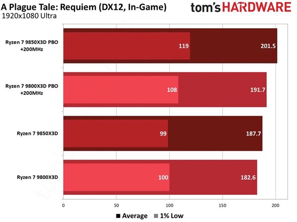 根据Tom’s Hardware的游戏实测数据,《瘟疫传说:安魂曲》中,9800X3D开启PBO后性能提升4.4%,甚至超越9850X3D默认表现;后者开启PBO后同样获得7.3%的明显增长。