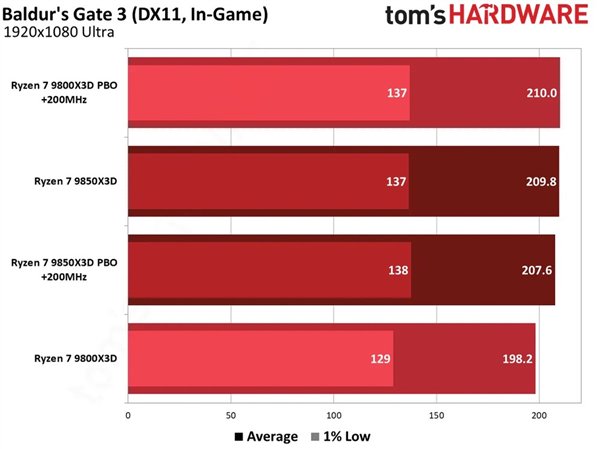 Tom’s Hardware测试发现,当9800X3D开启PBO功能,允许主板自动决定功耗限制并叠加+200MHz手动Boost偏移后,性能表现已非常接近9850X3D默认状态。