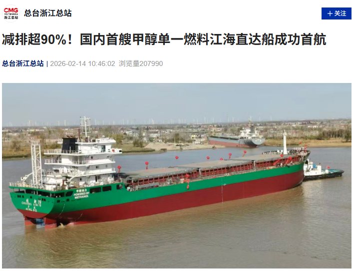 IT之家 2 月 14 日消息,据央视总台浙江总站报道,今日,江苏勤丰船厂码头汽笛长鸣,国内首艘以甲醇为单一燃料的江海直达船舶 ——“创新 19”轮正式启航,驶往宁波舟山港。这是我国首艘 15000 吨级甲醇单一燃料特定航线江海直达船舶,其首航标志着甲醇燃料在我国航运领域的商业化应用迈出关键一步。