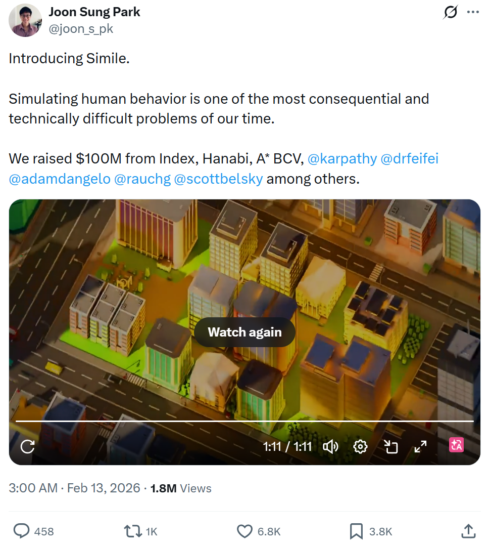 刚刚,论文作者之一 Joon Sung Park 也在 X 上正式官宣了 Simile 的成立,并披露公司已完成 1 亿美元融资 。投资人包括李飞飞、Andrej Karpathy 等众多 AI 大佬。