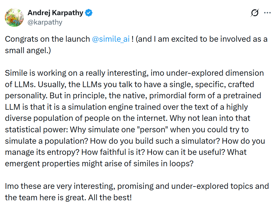 作为投资者之一的 Karpathy 表示:Simile 正在探索一个非常有趣、但仍被低估的 LLM 维度。通常我们与之对话的大模型,往往被赋予一个单一、精心设定的人格。但从原理上看,一个预训练 LLM 的原生形态,其实更像是一个基于互联网海量、多样化人类文本训练而成的模拟引擎。