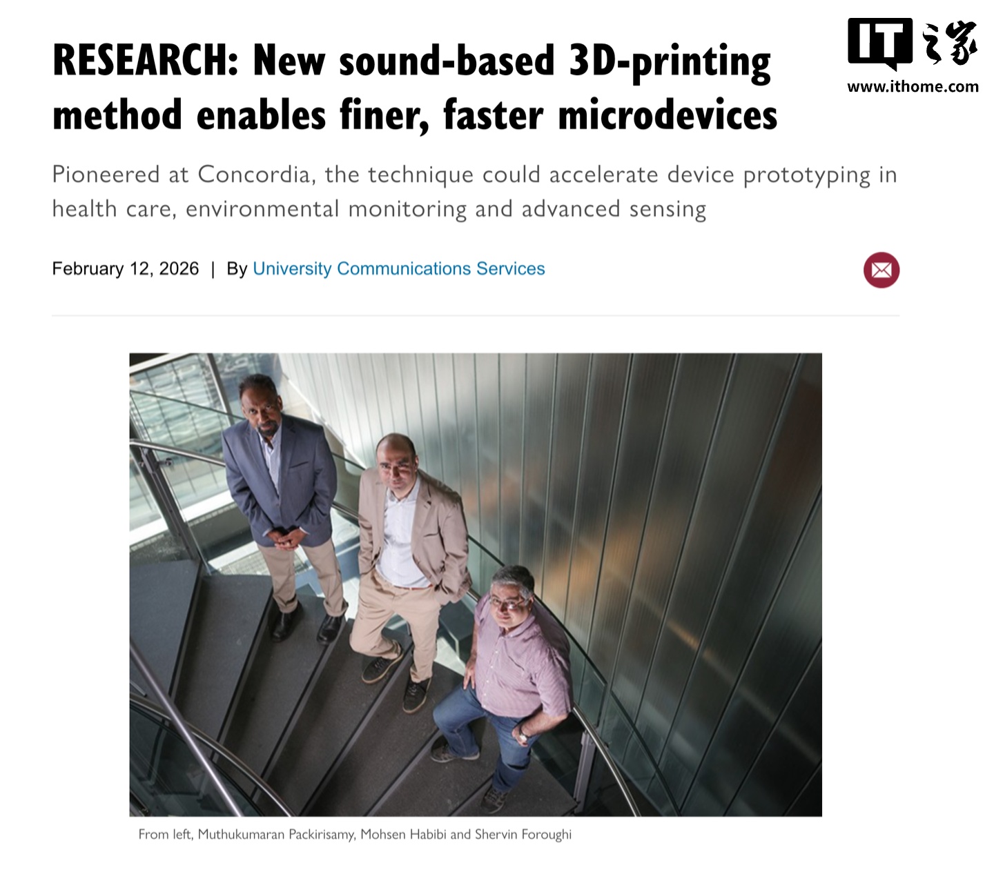 IT之家 2 月 14 日消息,当地时间 2 月 12 日,加拿大康考迪亚大学宣布在微制造领域实现突破,研发出“近场声打印”(PSP)技术,研究成果在《微系统与纳米工程》上发表。该方法通过聚焦超声波直接固化液态聚合物,打印精度相比以往声学打印方案提升约十倍。
