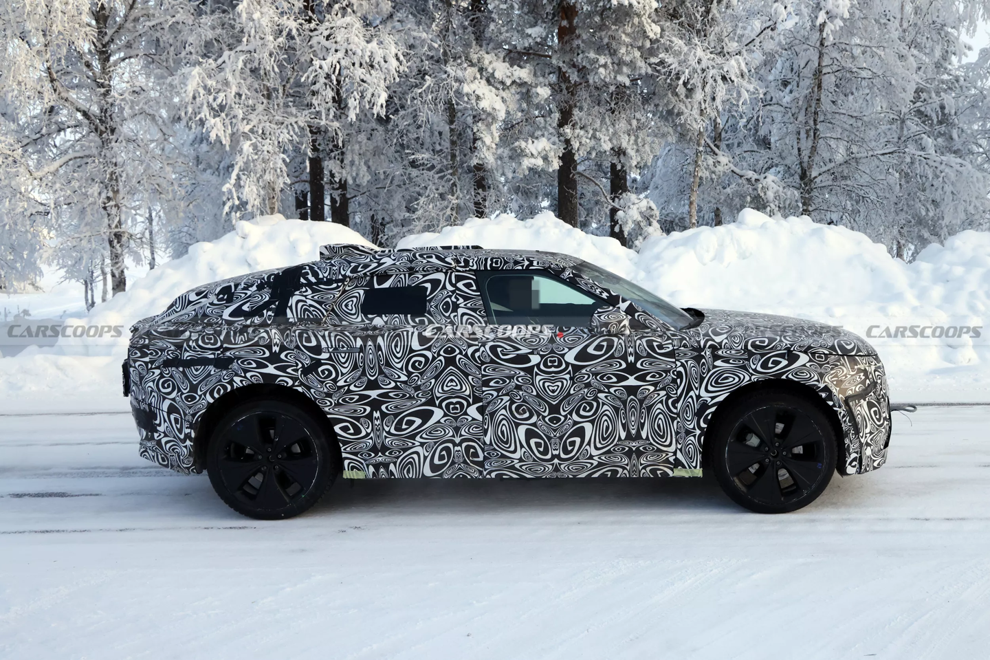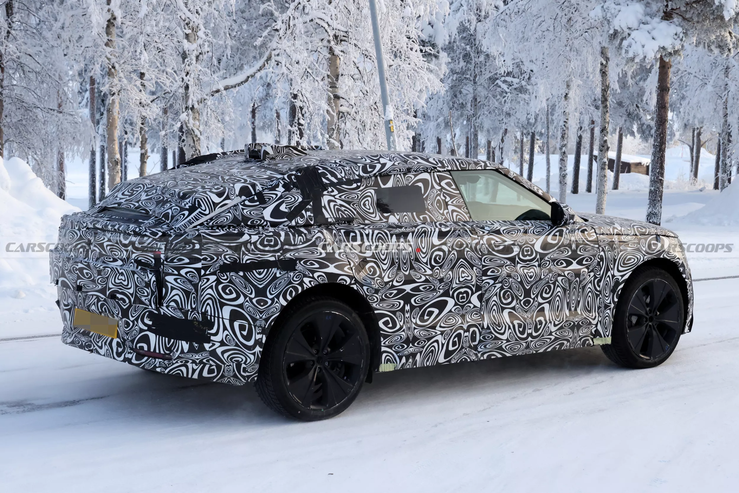 测试车配备后部充电口与隐藏式门把手,车身线条更加简洁,通过局部伪装掩盖细节。
