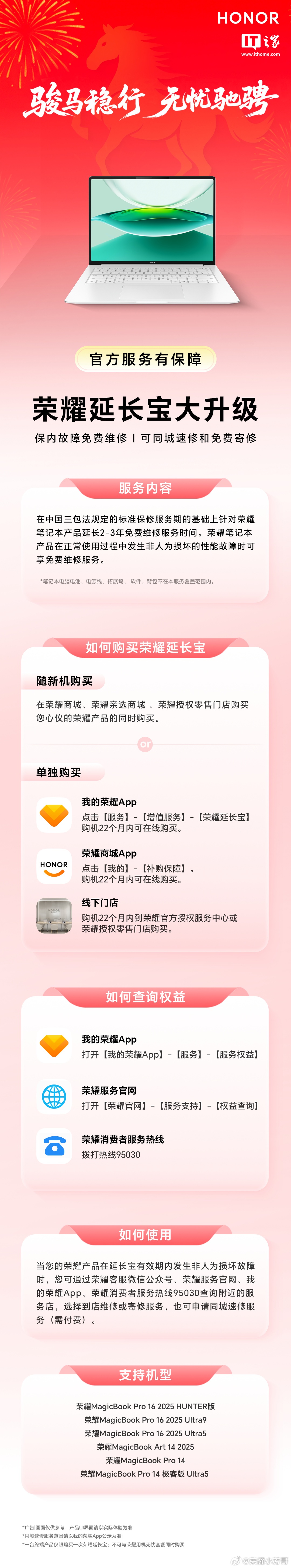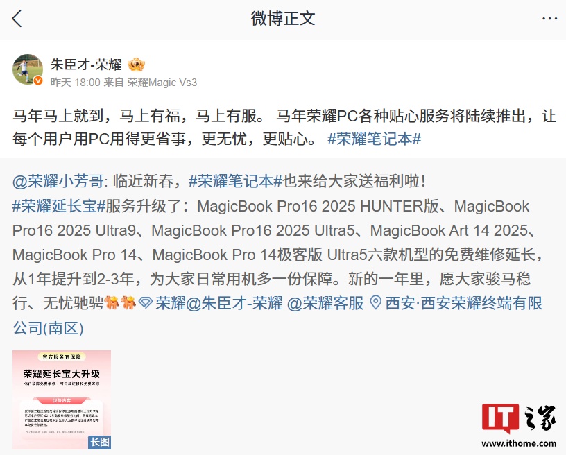 IT之家 2 月 15 日消息,荣耀产品维护与升级 @荣耀小芳哥 昨日官宣了笔记本的新春福利 —— 荣耀延长宝服务升级。据介绍,六款机型的免费维修从 1 年延长到 2-3 年。