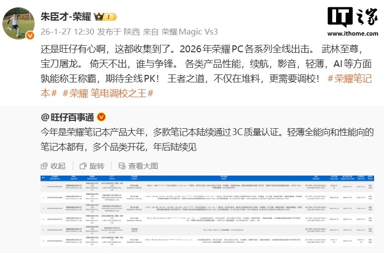 值得一提的是,有消息称今年是荣耀笔记本产品大年,多款笔记本陆续通过 3C 质量认证,轻薄全能向和性能向的笔记本都有。