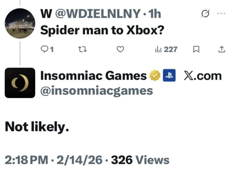 IT之家 2 月 15 日消息,索尼旗下失眠组(Insomniac Games)昨天在 X 平台回答粉丝疑问时表示,《漫威蜘蛛侠》系列游戏“不太可能”登上微软 Xbox 平台。