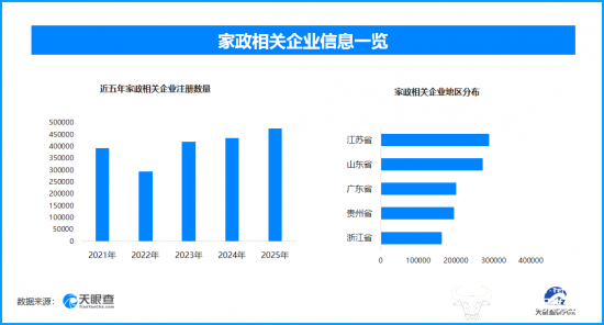 天眼查专业版数据显示,截至目前我国现存在业、存续状态的家政相关企业超304.4万家。其中,2025年新增注册相关企业约47.4万余家,从企业注册数量趋势来看,除了2022年有所下降外,家政相关企业的注册数量在近五年来呈现出平稳增长的态势,并在2025年达到顶峰。