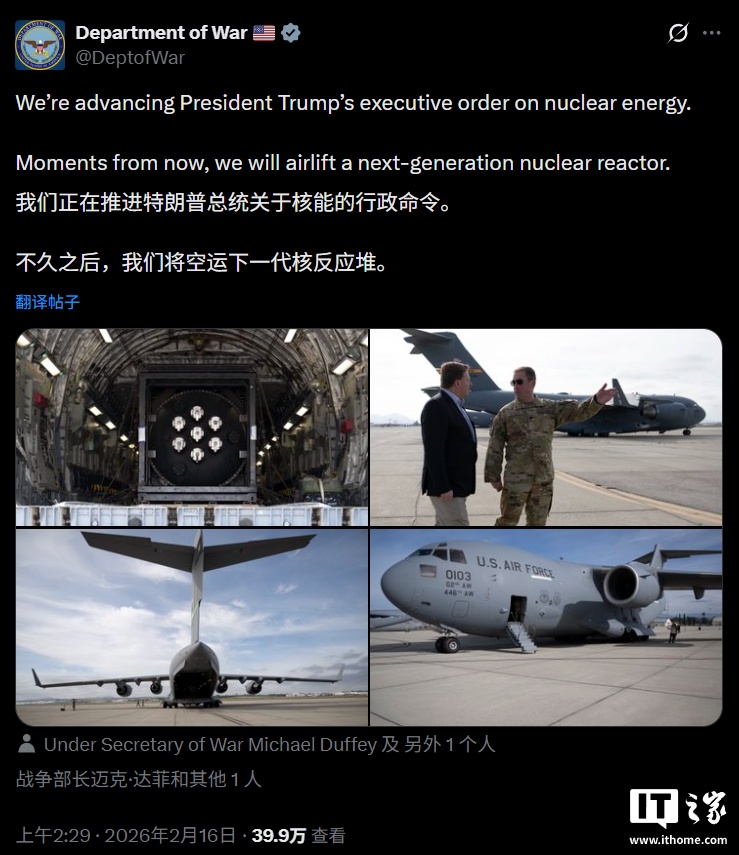IT之家 2 月 16 日消息,美国“战争部”今日(2 月 16 日)在社交媒体上发文预告,将“空运下一代核反应堆”,并称此举是遵循美国总统特朗普推广核能的命令。