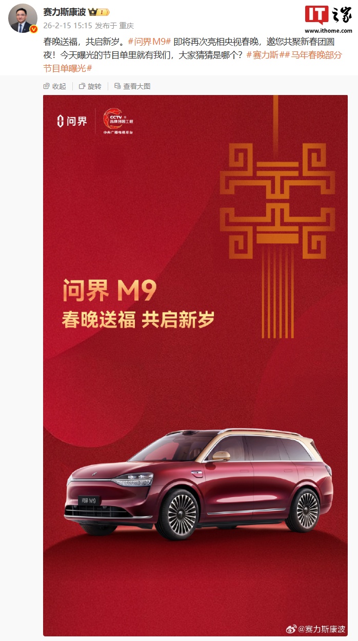 IT之家 2 月 16 日消息,赛力斯集团副总裁康波昨日发文宣布,鸿蒙智行问界 M9 汽车将再次亮相央视春晚,已曝光的节目单里就有问界。