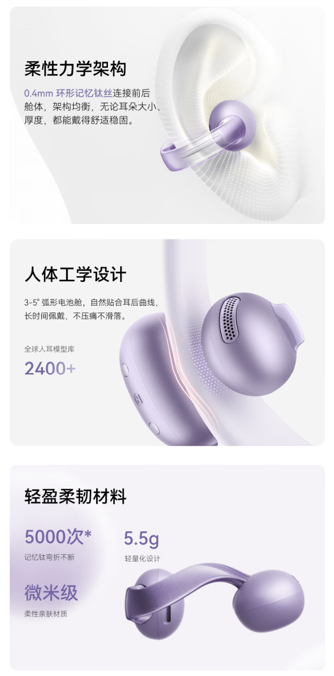 该耳机可选云纱白、夜羽黑、雪青色三种配色,耳机充电盒及本体均采用哑光设计,内置 0.4mm 环形记忆钛丝,耳机整体重量 5.5g,支持 IP55 防水防尘。耳机搭载 12mm 动圈,内置蓝牙 6.0 技术,单耳机续航 7 小时,配合充电盒续航至高可达 28 小时。