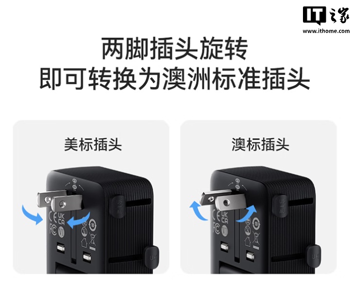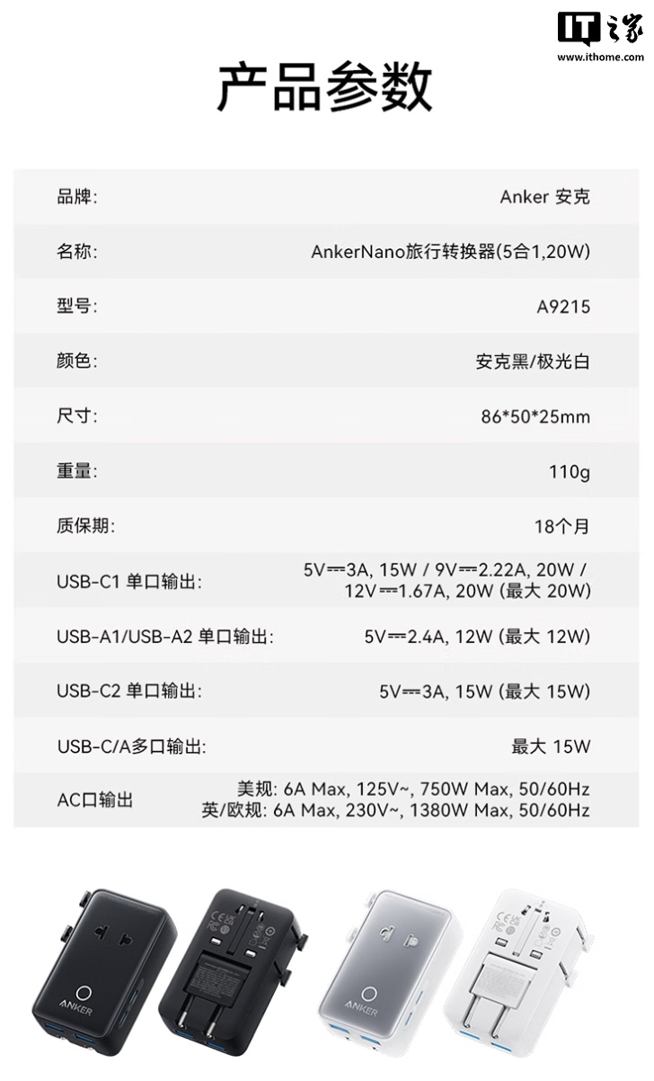 该产品可选黑白双色,与常见的小方块造型转换头相比,安克的这一产品整体更为纤薄,整体尺寸 86x50x25mm,其中欧标插脚采用卡扣外翻设计,美标 / 澳标 / 英标采用伸出式设计。