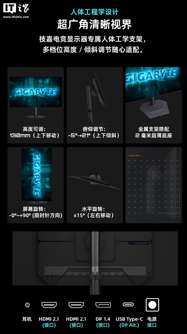 此外,这款显示器内置无频闪技术,支持 VRR(可变刷新率),减少频闪,内置 AI OLED 防烧屏功能,带有 3 年质保,配备两个 HDMI 2.1、一个 DP 1.4 以及一个 USB-C 接口,电源则是外置设计。显示器支架支持升降 / 倾斜 / 旋转,亦支持 VESA 壁挂。