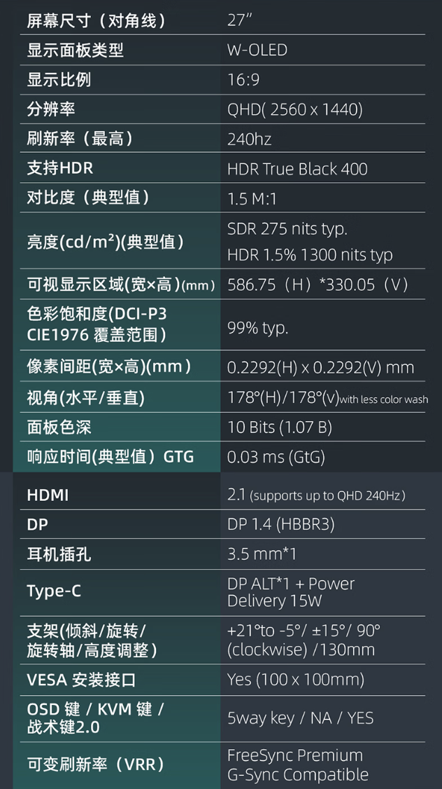 这款显示器搭载一块 2560×1440 分辨率 240Hz W-OLED 面板,能够有效减少光线漫射,支持 10-Bit 色深,覆盖 99% DCI-P3 色域,满足游戏之余的观影、修图需求,GTG 响应时间为 0.03ms,让用户在 FPS 游戏中抢占先机,兼容 G-Sync 防撕裂技术。