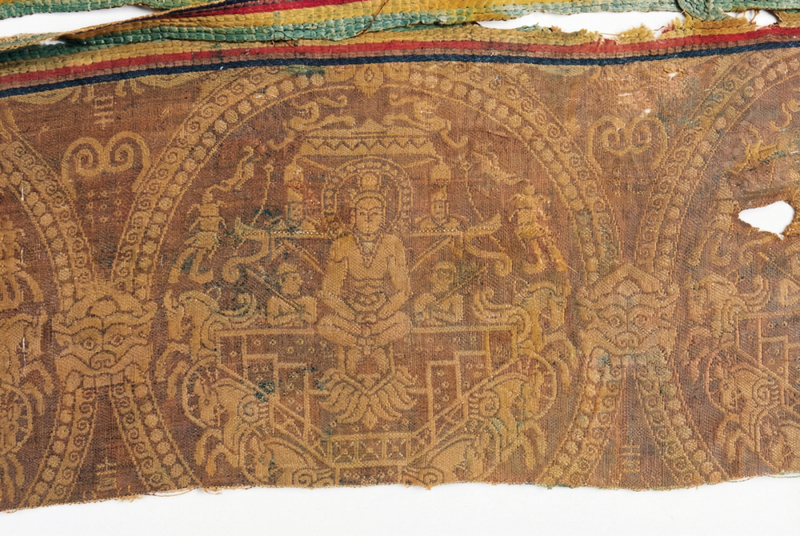 红地连珠日神六驾织锦残片,出自青海都兰县热水乡吐蕃血渭一号大墓,这是北朝至盛唐时期流行的纹样之一。图中的日神坐在六匹马拉的马车上。根据唐代善无畏所翻译的密教经典《尊胜佛顶修瑜伽法仪轨》的记载,“日天子”乘坐的是“五马车”,但是根据同一时期高僧一行在《大日经疏》的记述,日天是在“八马车辂中”,从阿波罗的四驾战车到密教的八马车辂,排场越来越大。