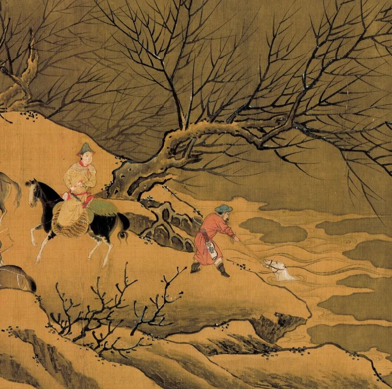 传元代钱选《杨贵妃上马图》中骑在马上的唐玄宗回首望着正在上马的杨贵妃。