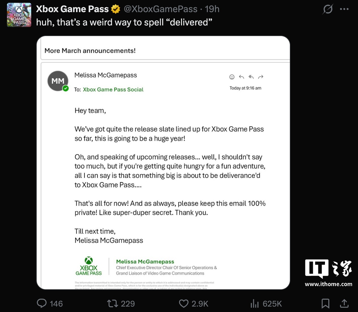 不过,微软在原文中将“delivered”单词写成了“deliverance”,官方也在配文中提醒读者“这个单词的拼写方式真奇怪”。对此,外界推测这大概率是在暗示《天国:拯救 2(Kingdom Come: Deliverance 2)》即将加入 Xbox Game Pass 游戏阵容。