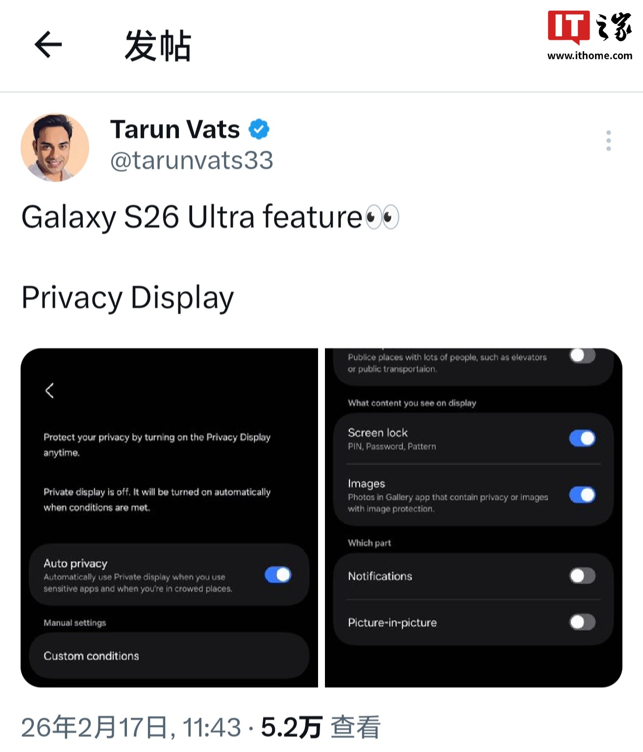 IT之家 2 月 17 日消息,博主 @tarunvats33 今日在 X 曝光了三星 Galaxy S26 Ultra 手机的防窥屏幕设置界面。