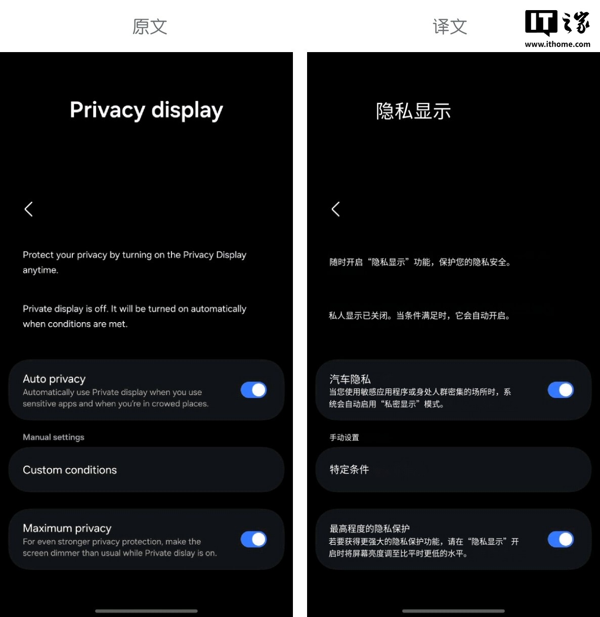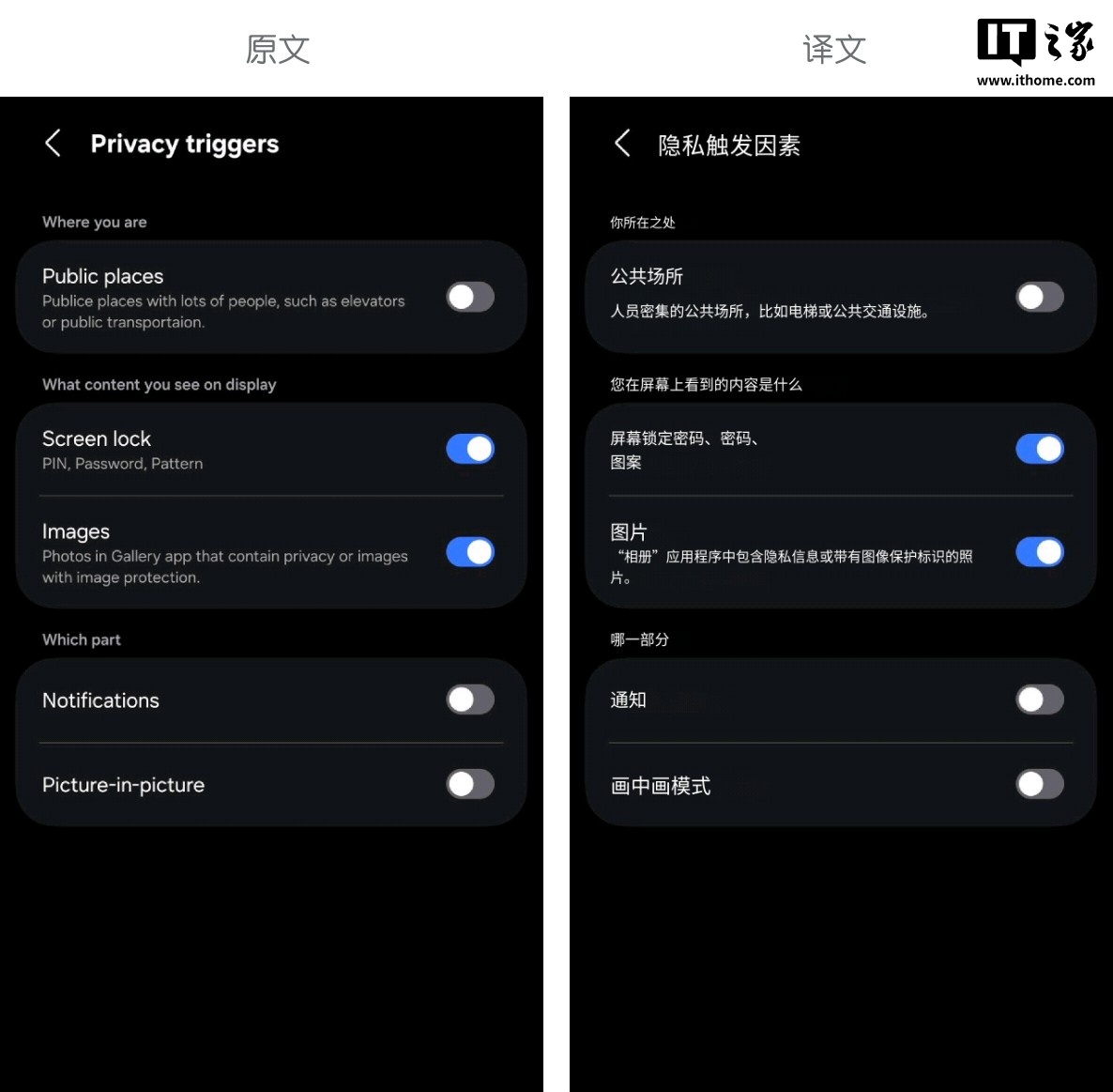 从图片可以看到,三星 Galaxy S26 Ultra 的防窥屏支持自动触发、按内容触发、局部控制等,同时提供触发因素设置(例如是否在公共场合)等功能。IT之家附相关页面如下(图片内容已做机翻处理):