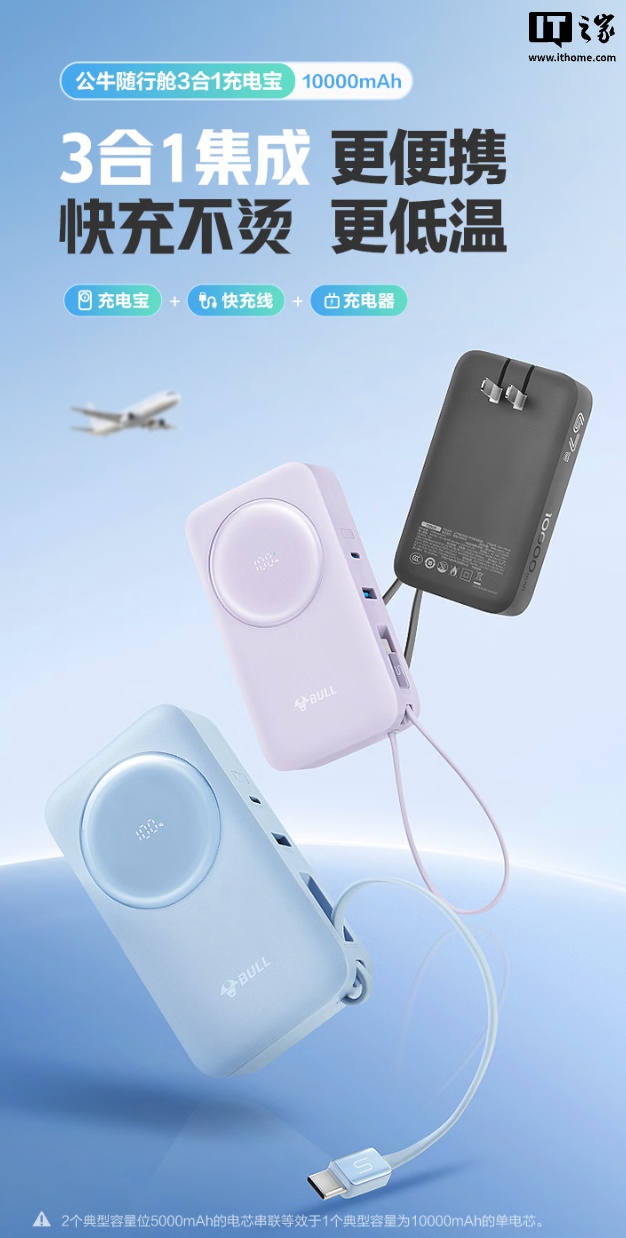 IT之家 2 月 17 日消息,公牛现已在京东上架一款自带线 67W 三合一充电头 / 移动电源,该产品采用 2C+1A 设计,内置 10000 mAh 电芯,定价 289 元。