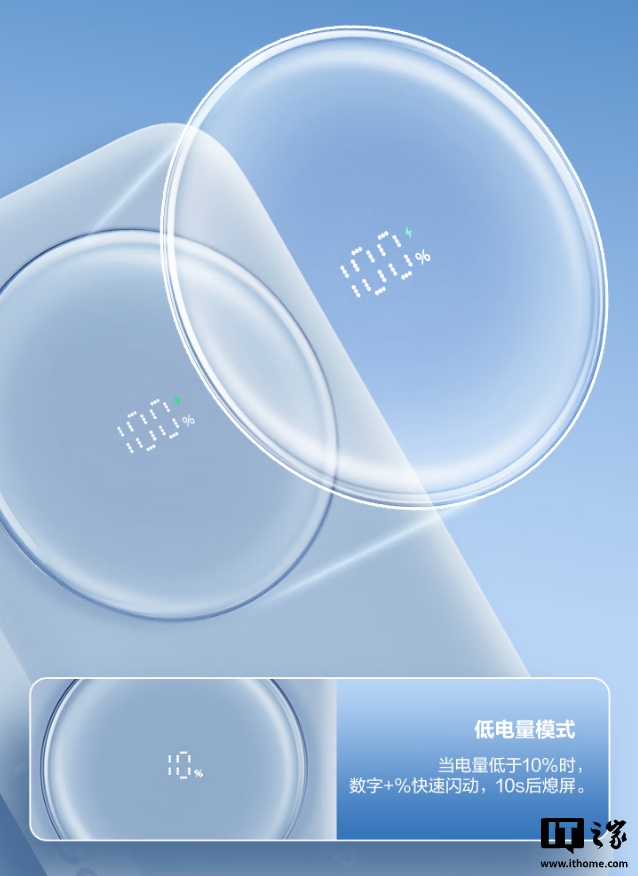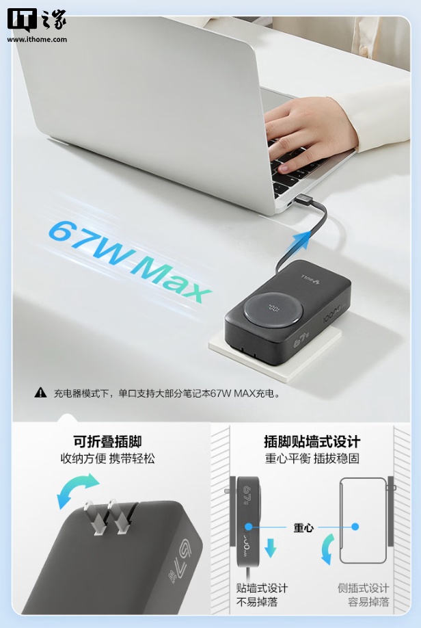 该产品提供多种配色可选,正面配备 LED 数显屏,背面带有可折叠插脚。在作为充电头模式时其 USB-C 接口 / 线缆支持以 67W 输出,移动电源模式下支持以 30W 输入 / 输出。