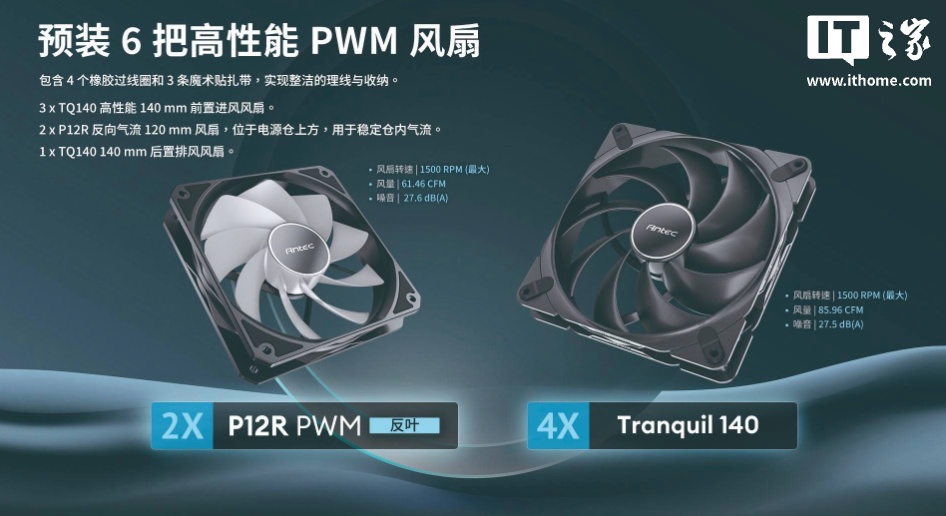该机箱预装 6 把风扇(2 把 P12R 12cm 反叶底部进风和 4 把 Tranquil 14cm 正叶前进后出)。除此之外机箱的前面板风扇位还可通过切换支架固定孔位来兼容 2 个 20cm 风扇或 3 个 12cm 风扇,最大支持 420 冷排。顶部可安装 2 把 14cm 风扇或 3 把 12cm 风扇。