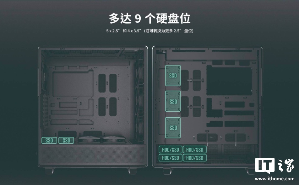 兼容性方面,该机 CPU 散热器限高 190mm,电源正常后装限长 230mm,侧装则是 170mm。机箱至多可安装 4 块 3.5 英寸硬盘 + 5 块 2.5 英寸硬盘。
