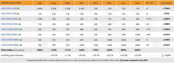 但本月SO-DIMM价格环比飙升23.4%,较2025年7月累计涨幅已达369%,其中,4GB DDR4-2400 SO-DIMM单品本月暴涨193%,8GB DDR5-4800 SO-DIMM涨幅接近49%。