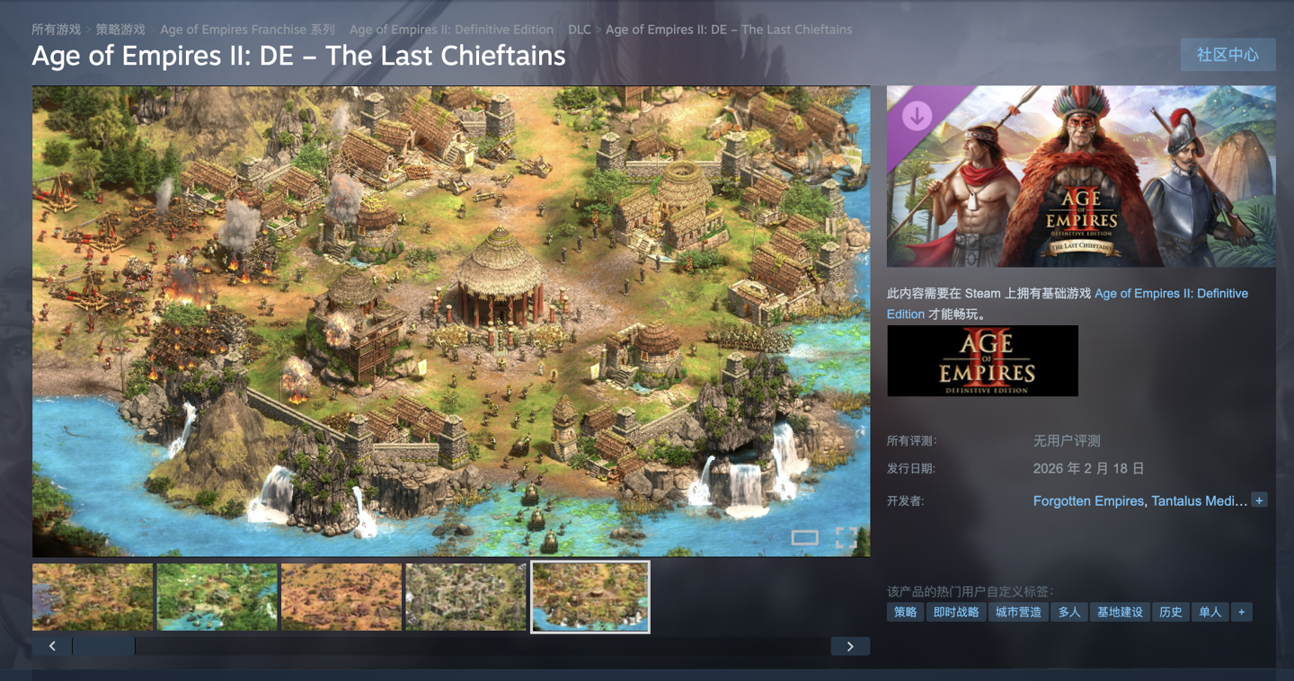 IT之家 2 月 17 日消息,《帝国时代 2:决定版》大型 DLC “最后的酋长”将于 2 月 18 日(明天)凌晨 2 点解锁,本作在 Steam 国区首发 8.5 折后到手价 83.3 元,原价 96 元。IT之家附商店页链接