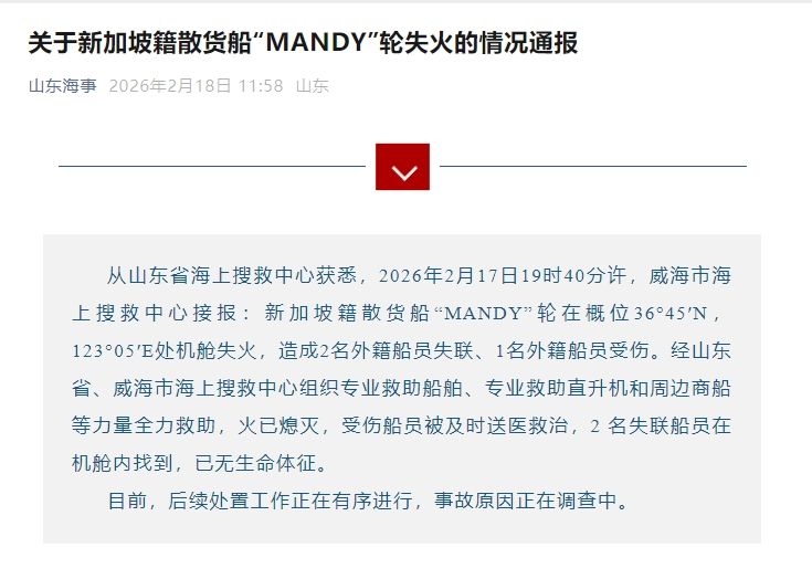 新京报讯 据山东海事消息,从山东省海上搜救中心获悉,2026年2月17日19时40分许,威海市海上搜救中心接报:新加坡籍散货船“MANDY”轮在概位36°45′N,123°05′E处机舱失火,造成2名外籍船员失联、1名外籍船员受伤。经山东省、威海市海上搜救中心组织专业救助船舶、专业救助直升机和周边商船等力量全力救助,火已熄灭,受伤船员被及时送医救治,2 名失联船员在机舱内找到,已无生命体征。