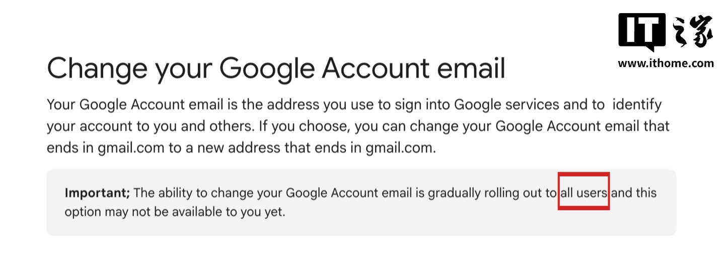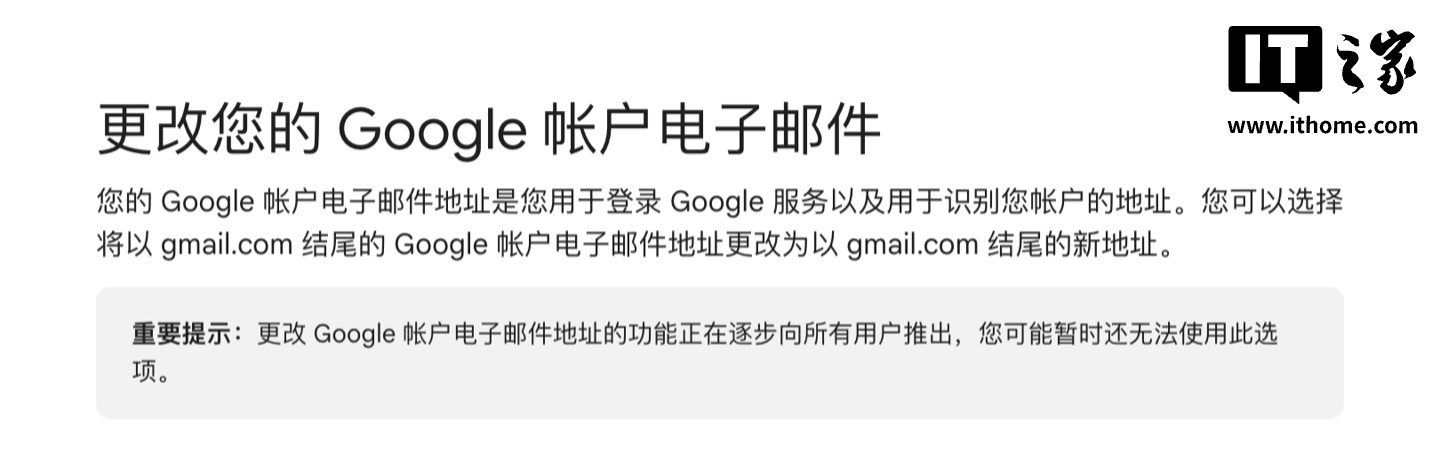 IT之家 2 月 18 日消息,谷歌在去年 12 月悄悄更新支持页面,透露正在灰度测试允许部分用户更改谷歌账号 @Gmail.com 电子邮件地址前缀,不过当时相应说明文档仅提供印地语版本,因此外界认为这可能只是一项临时性的测试。