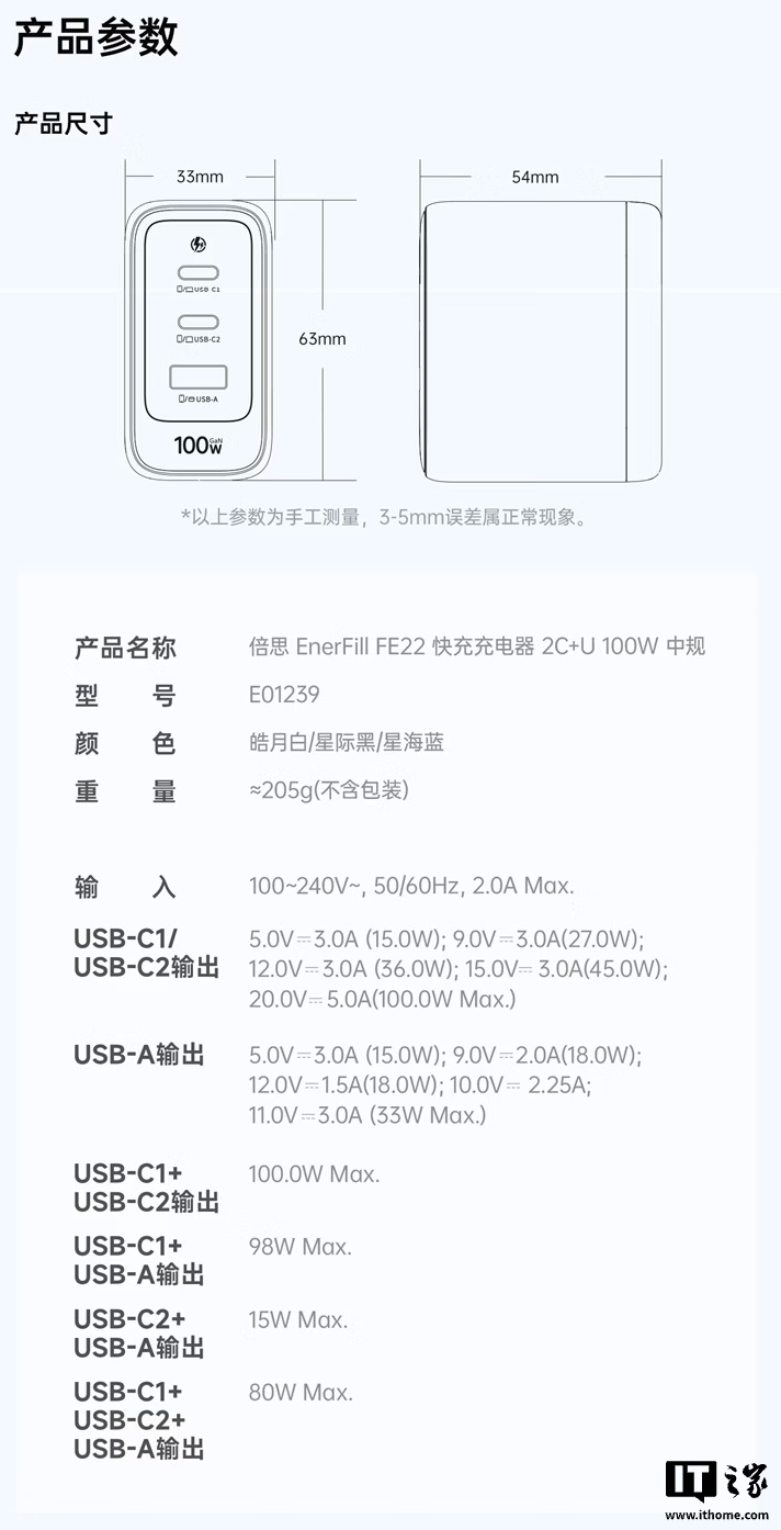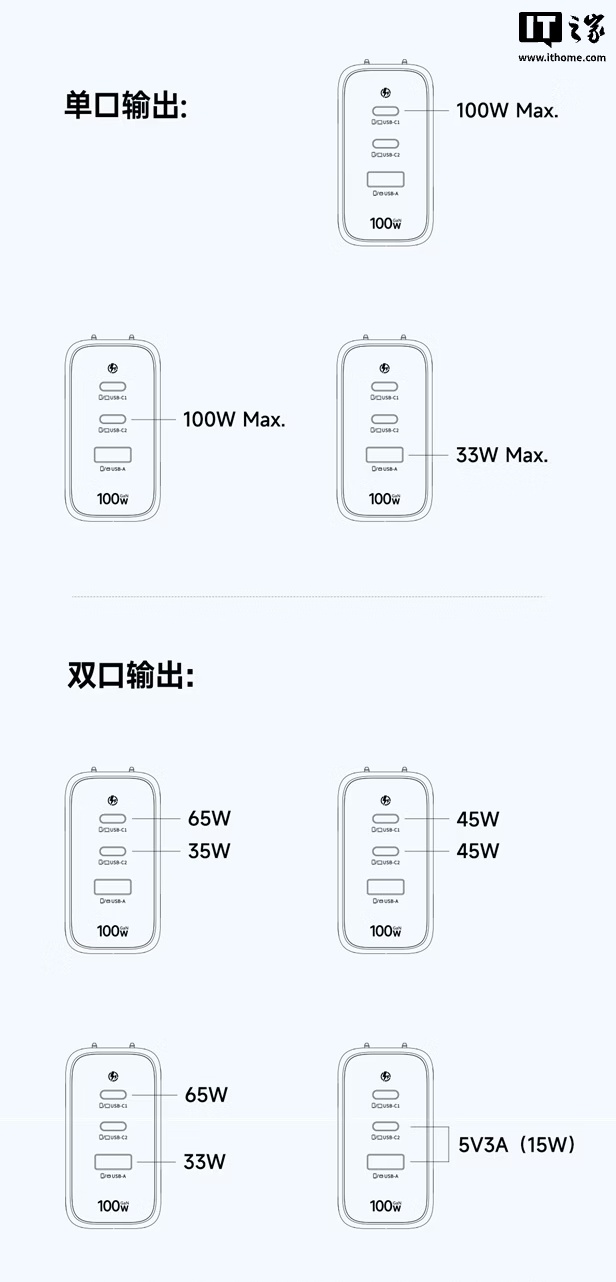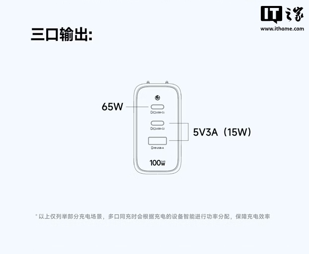 该充电头可选黑白双色,整体重量 205g,使用可折叠插脚,其中 USB-C1/C2 接口均至高支持 100W 输出,USB-A 接口至高支持 33W 输出。充电头支持小米 100W 澎湃秒充,同时兼容 PD / UFCS / PPS / SCP 协议。
