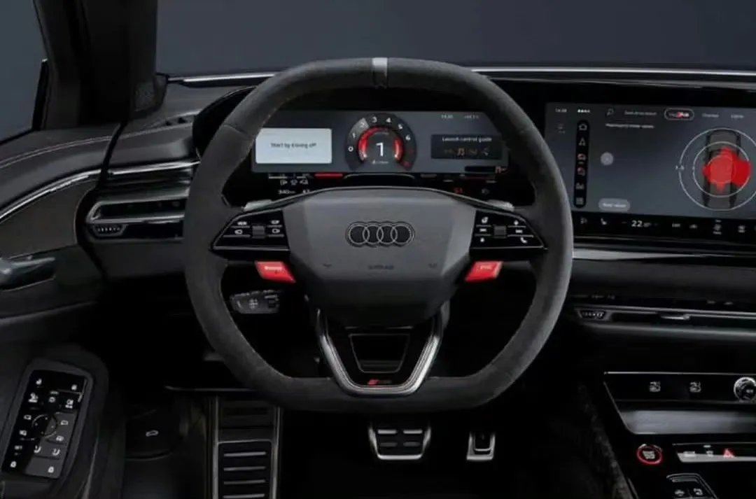 内饰延续奥迪运动家族风格,大面积 Alcantara、方向盘红色快捷键以及多处 RS 徽标强化运动氛围。数字座舱采用专属界面,配备 11.9 英寸仪表盘、14.5 英寸中控屏和 10.9 英寸副驾屏幕。