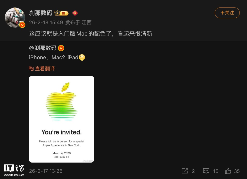 IT之家 2 月 18 日消息,博主 @刹那数码 援引苹果 3 月 4 日发布会邀请函,透露苹果届时将推出传闻已久的平价版 MacBook,邀请函中苹果 Logo 正是“入门版 Mac 的配色”。