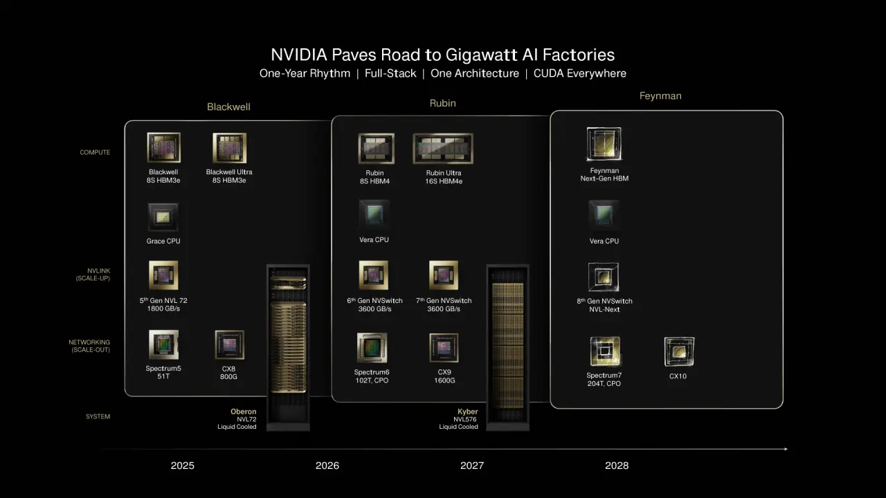 除了上述猜测,该媒体还指出英伟达或许会提前展示 Feynman 架构的原型,不过这种可能性偏低。该架构原计划于 2028 年接棒 Rubin,并已列入 2025 年的路线图。Feynman 架构预计将采用台积电 A16(1.6nm)工艺,并引入硅光子技术,利用光而非电进行数据传输,从而突破“摩尔定律”的物理限制。
