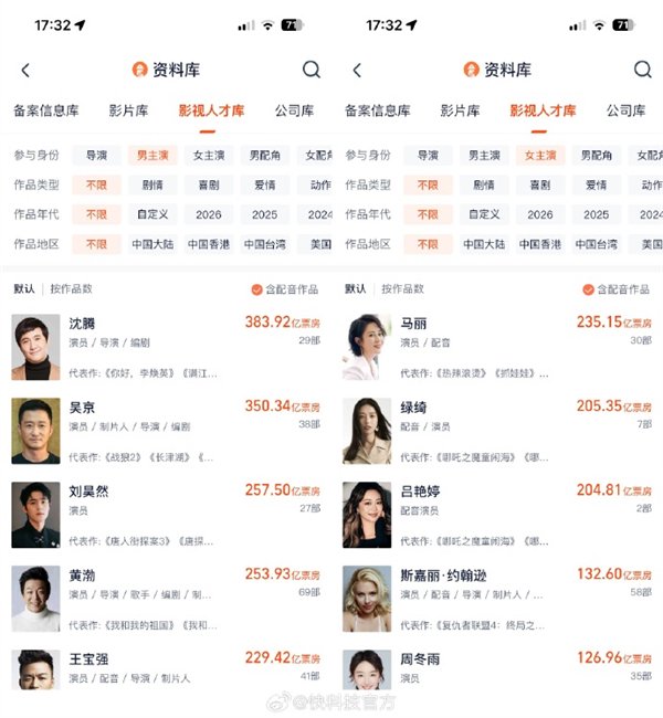 女主演方面,马丽以235.15亿元领跑,她与沈腾多次合作的喜剧作品贡献了主要票房。绿绮凭借《哪吒之魔童闹海》等动画配音作品,以205.35亿元位居第二;吕艳婷同样因《哪吒之魔童闹海》的配音,以204.81亿元位列第三。