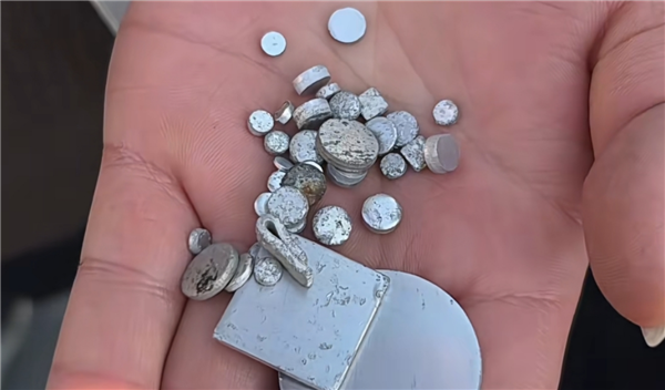 从网友晒出的图片看,现场捡到的是一些圆盘形状的白色片状物,这些片状物类似大小不同的纽扣电池,表面有腐蚀或使用痕迹。