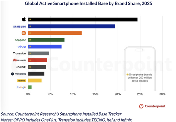 调研机构Counterpoint Research最新报告显示,截至2025年底,全球正在使用的智能手机中,苹果以25%的活跃设备份额位居榜首。