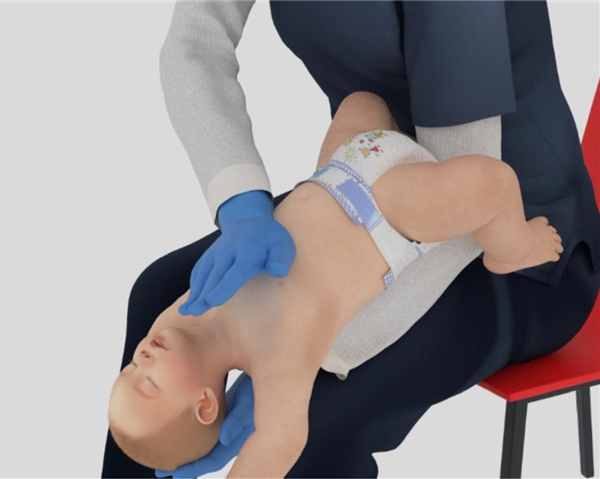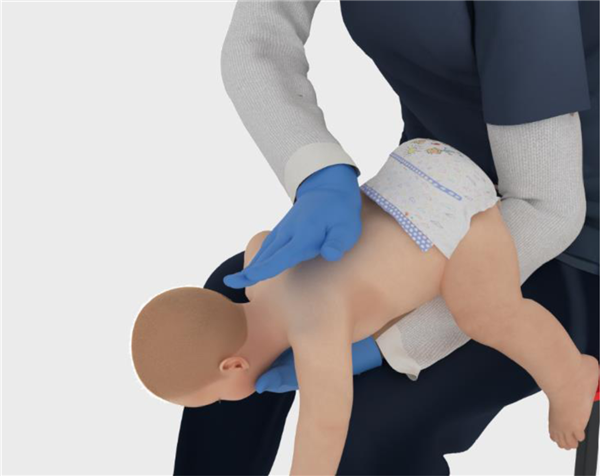 若异物仍未排出,此时将孩子夹住翻转,用掌根按压胸部 5 次,重复以上动作。