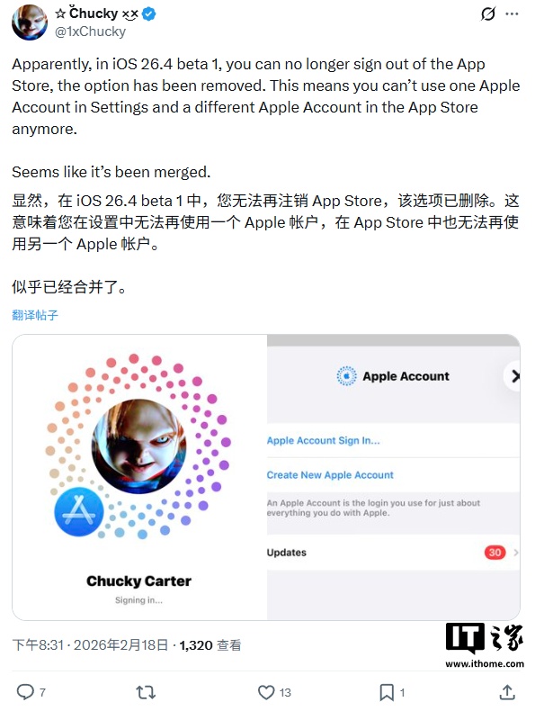 后续有用户发现,苹果在 iOS 26.4 Beta 1 测试版本中调整了账户切换流程,移除了 App Store 原有的账户退出功能,现在必须转到设置里才能切换账户。