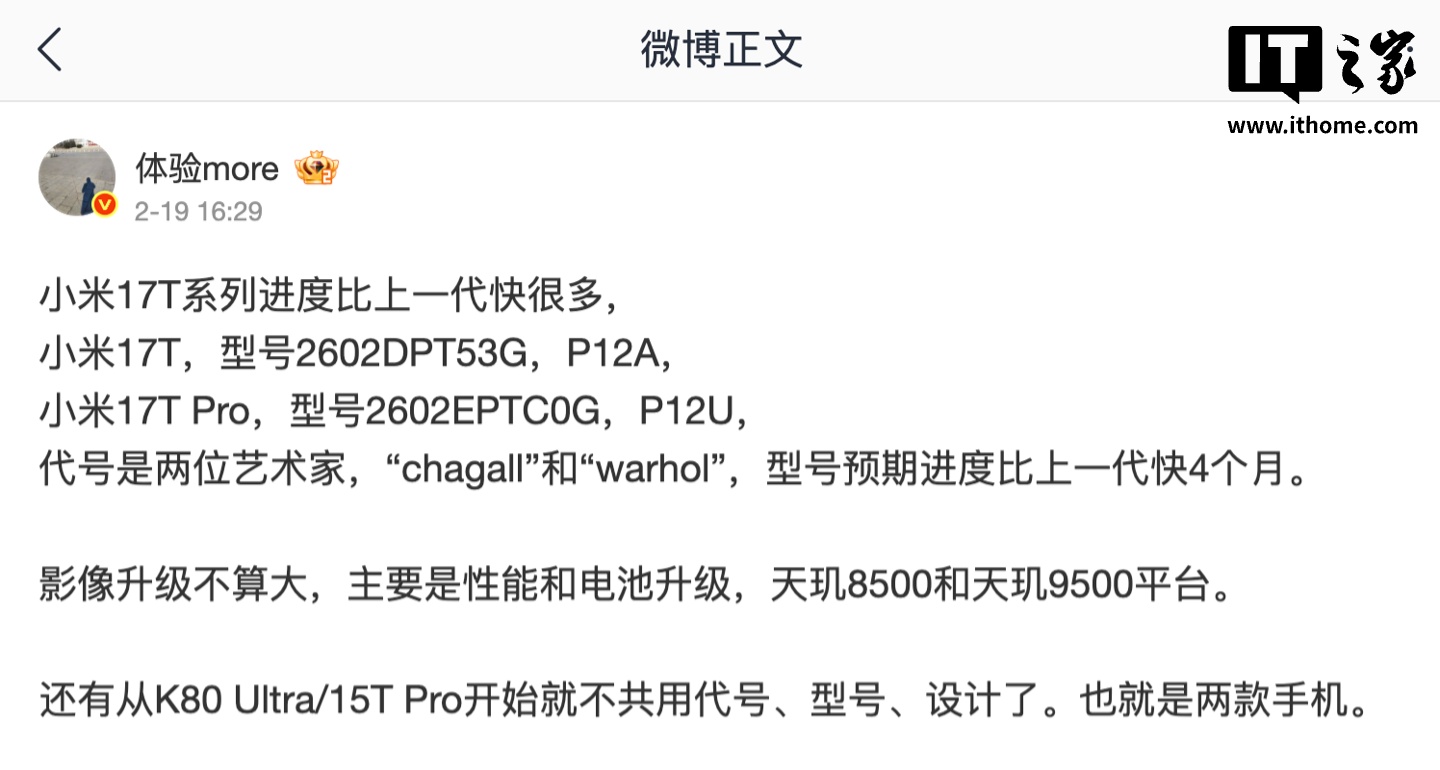IT之家 2 月 20 日消息,博主 @体验more 昨天在微博透露,小米 17T 系列手机的研发进度比上一代快很多。