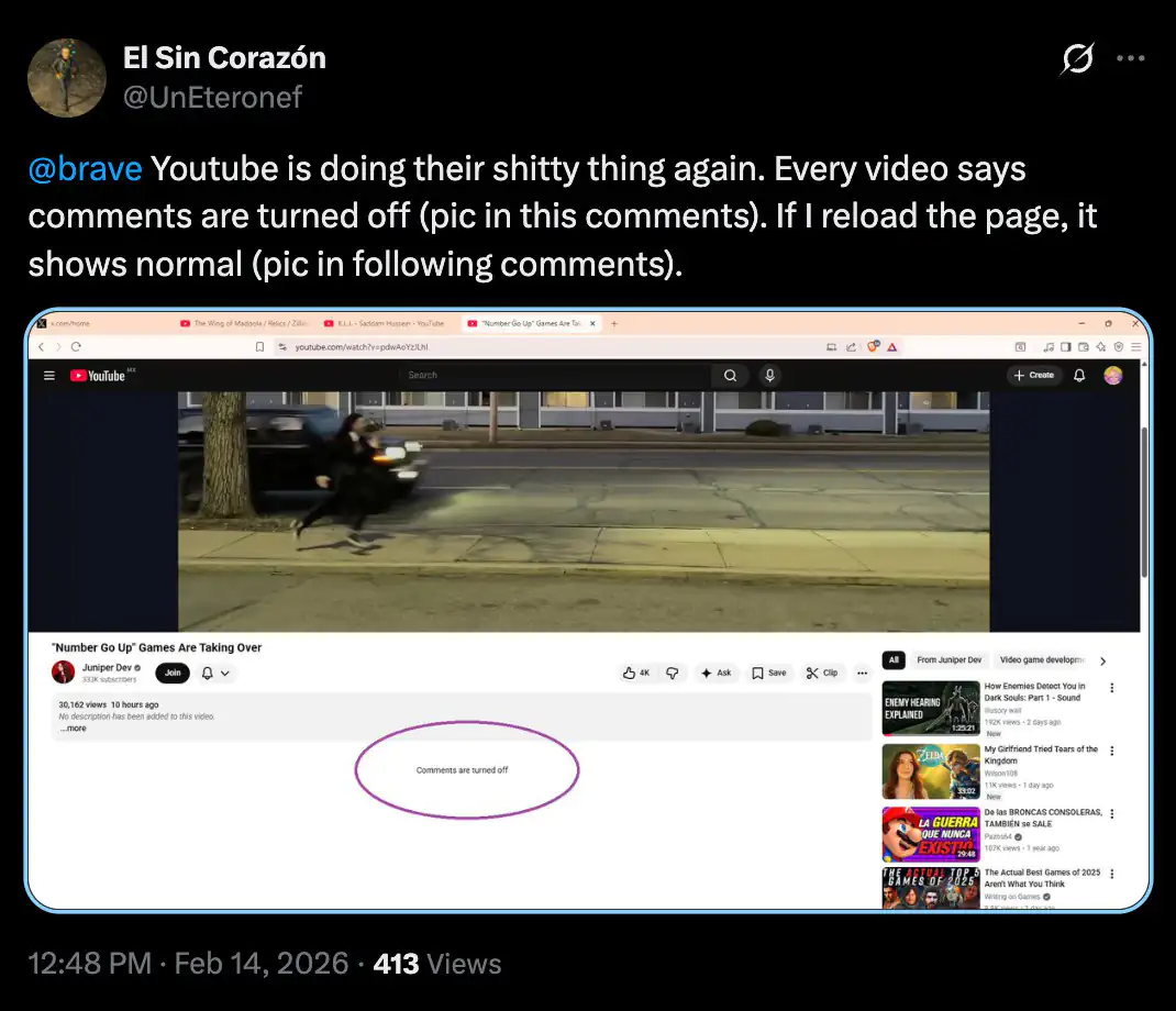 根据 X 平台、Reddit 论坛大量用户反馈,他们只要打开广告拦截器,YouTube 视频下方的评论区就会变为“评论已关闭”,完全无法查看、发表评论。甚至有的人还被屏蔽了视频简介,哪怕订阅了 Premium 计划,只要打开拦截器就会受到影响。