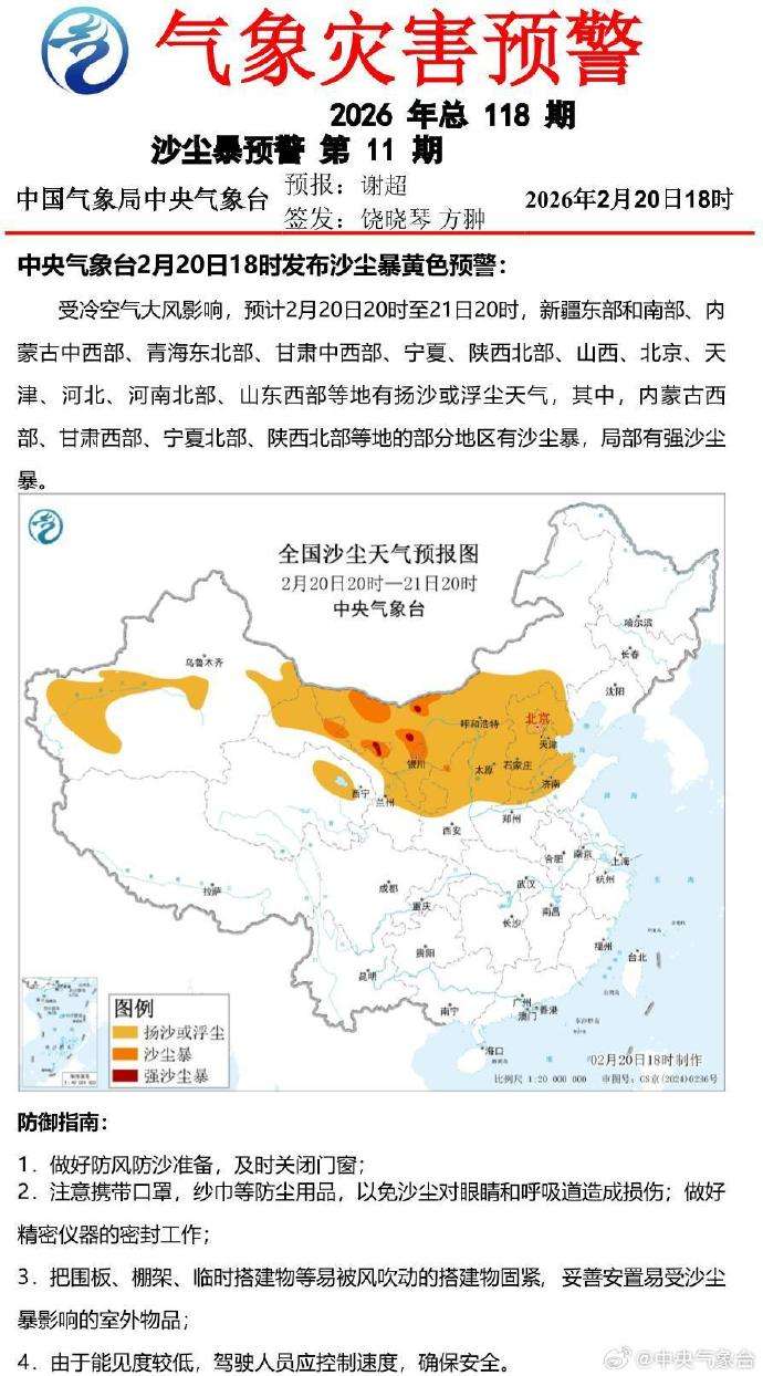 新京报讯 中央气象台2月20日18时发布沙尘暴黄色预警。