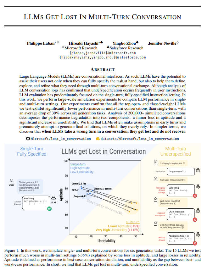 研究人员对包括 GPT-4.1、Gemini 2.5 Pro、Claude 3.7 Sonnet、o3、DeepSeek R1 和 Llama 4 在内的 15 款顶尖模型进行了超过 20 万次模拟对话分析,揭示出一个被称为“迷失会话”的系统性缺陷。